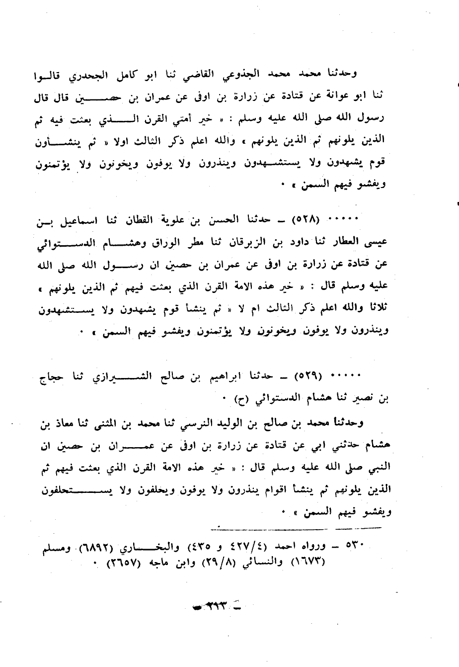 529 - حَدَّثَنَا إِبْرَاهِيمُ بْنُ صَالِحٍ الشِّيرَازِيُّ، ثنا حَجَّاجُ بْنُ نُصَيْرٍ، ثنا هِشَامُ الدَّسْتُوَائِيُّ، ح وَحَدَّثَنَا مُحَمَّدُ بْنُ صَالِحِ بْنِ الْوَلِيدِ النَّرْسِيُّ، ثنا مُحَمَّدُ بْنُ الْمُثَنَّى، ثنا مُعَاذُ بْنُ هِشَامٍ، حَدَّثَنِي أَبِي، عَنْ قَتَادَةَ، عَنْ زُرَارَةَ بْنِ أَوْفَى، عَنْ عِمْرَانَ بْنِ حُصَيْنٍ، أَنَّ النَّبِيَّ صَلَّى اللهُ عَلَيْهِ وَسَلَّمَ قَالَ: «§خَيْرُ هَذِهِ الْأُمَّةِ الْقَرْنُ الَّذِي بُعِثْتُ فِيهِمْ ثُمَّ الَّذِينَ يَلُونَهُمْ، ثُمَّ يَنْشَأُ أَقْوَامٌ يَنْذُرُونَ وَلَا يُوفُونَ، وَيَحْلِفُونَ وَلَا يُسْتَحْلَفُونَ، وَيَفْشُو فِيهِمُ السِّمَنُ»