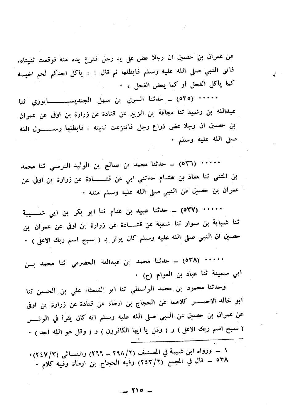 535 - حَدَّثَنَا السَّرِيُّ بْنُ سَهْلٍ الْجُنْدِ يْسَابُورِيُّ، ثنا عَبْدُ اللهِ بْنُ رُشَيْدٍ، ثنا مَجَاعَةُ بْنُ الزُّبَيْرِ، عَنْ قَتَادَةَ، عَنْ زُرَارَةَ بْنِ أَوْفَى، عَنْ عِمْرَانَ بْنِ حُصَيْنٍ، أَنَّ §رَجُلًا عَضَّ ذِرَاعَ رَجُلٍ، فَانْتُزِعَتْ ثَنِيَّتُهُ، «فَأَبْطَلَهَا رَسُولُ اللهِ صَلَّى اللهُ عَلَيْهِ وَسَلَّمَ»