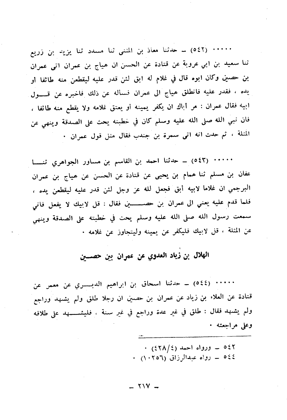 542 - حَدَّثَنَا مُعَاذُ بْنُ الْمُثَنَّى، ثنا مُسَدَّدٌ، ثنا يَزِيدُ بْنُ زُرَيْعٍ، ثنا سَعِيدُ بْنُ أَبِي عَرُوبَةَ، عَنْ قَتَادَةَ، عَنِ الْحَسَنِ، أَنَّ هَيَّاجَ بْنَ عِمْرَانَ أَتَى عِمْرَانَ بْنَ حُصَيْنٍ، وَكَانَ أَبُوهُ قَالَ فِي غُلَامٍ لَهُ: أَبَقَ لَئِنْ قَدَرَ عَلَيْهِ لَيَقْطَعَنَّ مِنْهُ طَائِفًا، أَوْ يَدَهُ فَقَدَرَ عَلَيْهِ، فَانْطَلَقَ هَيَّاجٌ إِلَى عِمْرَانَ فَسَأَلَهُ عَنْ ذَلِكَ، فَأَخْبَرَهُ عَنْ قَوْلِ أَبِيهِ، فَقَالَ عِمْرَانُ: مُرْ أَبَاكَ أَنْ يُكَفِّرَ يَمِينَهُ، أَوْ يُعْتِقَ غُلَامَهُ، وَلَا يَقْطَعَ مِنْهُ طَائِفًا، «فَإِنَّ نَبِيَّ اللهِ صَلَّى اللهُ عَلَيْهِ وَسَلَّمَ كَانَ فِي خُطْبَتِهِ §يَحُثُّ عَلَى الصَّدَقَةِ، وَيَنْهَى عَنِ الْمُثْلَةِ» ثُمَّ حَدَّثَ أَنَّهُ أَتَى سَمُرَةَ بْنَ جُنْدُبٍ فَقَالَ مِثْلَ قَوْلِ عِمْرَانَ