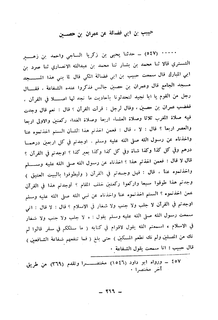 547 - حَدَّثَنَا زَكَرِيَّا بْنُ يَحْيَى السَّاجِيُّ، وَأَحْمَدُ بْنُ زُهَيْرٍ التُّسْتَرِيُّ، قَالَا: ثنا مُحَمَّدُ بْنُ بَشَّارٍ، ثنا مُحَمَّدُ بْنُ عَبْدِ اللهِ الْأَنْصَارِيُّ، ثنا صُرَدُ بْنُ أَبِي الْمُنَازِلِ، قَالَ: سَمِعْتُ حَبِيبَ بْنَ أَبِي فَضَالَةَ الْمَكِّيَّ، قَالَ: لَمَّا بُنِيَ هَذَا الْمَسْجِدُ مَسْجِدُ الْجَامِعِ، قَالَ وَعِمْرَانُ بْنُ حُصَيْنٍ جَالِسٌ فَذَكَرُوا عِنْدَهُ الشَّفَاعَةَ، فَقَالَ رَجُلٌ مِنَ الْقَوْمِ: يَا أَبَا نُجَيْدٍ لَتُحَدِّثُونَا بِأَحَادِيثَ مَا نَجِدُ لَهَا أَصْلًا فِي الْقُرْآنِ، فَغَضِبَ عِمْرَانُ بْنُ حُصَيْنٍ وَقَالَ لِرَجُلٍ: قَرَأْتَ الْقُرْآنَ؟ قَالَ: نَعَمْ، قَالَ: وَجَدْتَ فِيهِ صَلَاةَ الْمَغْرِبِ ثَلَاثًا، وَصَلَاةَ الْعِشَاءِ أَرْبَعًا، وَصَلَاةَ الْغَدَاةِ رَكْعَتَيْنِ، وَالْأُولَى أَرْبَعًا، وَالْعَصْرُ أَرْبَعًا؟ قَالَ: لَا، قَالَ: فَعَمَّنْ أَخَذْتُمْ هَذَا الشَّأْنَ؟ أَلَسْتُمْ أَخَذْتُمُوهُ عَنَّا، وَأَخَذْنَاهُ عَنْ رَسُولِ اللهِ صَلَّى اللهُ عَلَيْهِ وَسَلَّمَ، أَوَجَدْتُمْ فِي كُلِّ أَرْبَعِينَ دِرْهَمًا دِرْهَمًا، وَفِي كُلِّ كَذَا وَكَذَا شَاةً، وَفِي كُلِّ كَذَا وَكَذَا بَعِيرًا كَذَا، أَوَجَدْتُمْ فِي الْقُرْآنِ؟ قَالَ: لَا، قَالَ: فَعَمَّنٍ أَخَذْتُمْ هَذَا؟ أَخَذْنَاهُ عَنْ رَسُولِ اللهِ صَلَّى اللهُ عَلَيْهِ وَسَلَّمَ، وَأَخَذْتُمُوهُ عَنَّا، قَالَ: فَهَلْ وَجَدْتُمْ فِي الْقُرْآنِ {وَلْيَطَّوَّفُوا بِالْبَيْتِ الْعَتِيقِ} [الحج: 29] وَجَدْتُمْ هَذَا طُوفُوا سَبْعًا، وَارْكَعُوا رَكْعَتَيْنِ خَلْفَ الْمَقَامِ، أَوَجَدْتُمْ هَذَا فِي الْقُرْآنِ؟ عَمَّنْ أَخَذْتُمُوهُ؟ أَلَسْتُمْ أَخَذْتُمُوهُ عَنَّا، وَأَخَذْنَاهُ عَنْ نَبِيِّ اللهِ صَلَّى اللهُ عَلَيْهِ وَسَلَّمَ؟ أَوَجَدْتُمْ فِي الْقُرْآنِ لَا جَلَبَ وَلَا جَنَبَ وَلَا شِغَارَ فِي الْإِسْلَامِ؟ قَالَ: لَا، قَالَ: إِنِّي سَمِعْتُ رَسُولَ اللهِ صَلَّى اللهُ عَلَيْهِ وَسَلَّمَ يَقُولُ: «§لَا جَلَبَ وَلَا جَنَبَ وَلَا شِغَارَ فِي الْإِسْلَامِ» أَسَمِعْتُمُ اللهَ يَقُولُ لِأَقْوَامٍ فِي كِتَابِهِ: {مَا سَلَكَكُمْ فِي سَقَرٍ قَالُوا لَمْ نَكُ مِنَ الْمُصَلِّينَ وَلَمْ نَكُ نُطْعِمُ الْمِسْكِينَ} [المدثر: 43] حَتَّى بَلَغَ {فَمَا تَنْفَعُهُمْ شَفَاعَةُ الشَّافِعِينَ} [المدثر: 48] قَالَ حَبِيبٌ: «أَنَا سَمِعْتُ يَقُولُ الشَّفَاعَةَ»