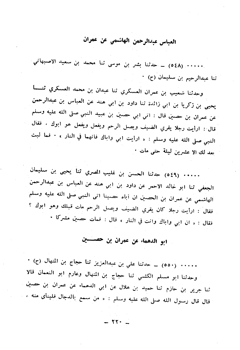 548 - حَدَّثَنَا بِشْرُ بْنُ مُوسَى، ثنا مُحَمَّدُ بْنُ سَعِيدٍ الْأَصْبَهَانِيُّ، ثنا عَبْدُ الرَّحِيمِ بْنُ سُلَيْمَانَ، ح وَحَدَّثَنَا شُعَيْبُ بْنُ عِمْرَانَ الْعَسْكَرِيُّ، ثنا عَبْدَانُ بْنُ مُحَمَّدٍ الْعَسْكَرِيُّ، ثنا يَحْيَى بْنُ زَكَرِيَّا بْنِ أَبِي زَائِدَةَ، ثنا دَاوُدُ بْنُ أَبِي هِنْدٍ، عَنِ الْعَبَّاسِ بْنِ عَبْدِ الرَّحْمَنِ، عَنْ عِمْرَانَ بْنِ حُصَيْنٍ قَالَ: أَتَى أَبُو حُصَيْنِ بْنِ عُبَيْدٍ النَّبِيَّ صَلَّى اللهُ عَلَيْهِ وَسَلَّمَ قَالَ: أَرَأَيْتَ رَجُلًا يُقْرِي الضَّيْفَ وَيَصِلُ الرَّحِمَ، وَيَفْعَلُ وَيَفْعَلُ هُوَ أَبُوكَ، فَقَالَ النَّبِيُّ صَلَّى اللهُ عَلَيْهِ وَسَلَّمَ: «§أَرَأَيْتَ أَبِي وَأَبَاكَ، فَإِنَّهُمَا فِي النَّارِ» . فَمَا لَبِثَ بَعْدَ ذَلِكَ إِلَّا عِشْرِينَ لَيْلَةً حَتَّى مَاتَ