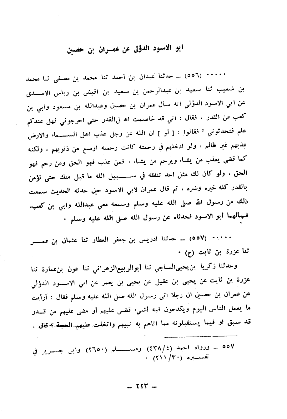 556 - حَدَّثَنَا عَبْدَانُ بْنُ أَحْمَدَ، ثنا مُحَمَّدُ بْنُ مُصَفَّى، ثنا مُحَمَّدُ بْنُ شُعَيْبٍ، ثنا سَعِيدُ بْنُ عَبْدِ الرَّحْمَنِ بْنِ سَعِيدِ بْنِ أُقَيْشِ بْنِ رَبَاسٍ الْأَسَدِيُّ، عَنْ أَبِي الْأَسْوَدِ الدُّؤَلِيِّ: أَنَّهُ سَأَلَ عِمْرَانَ بْنِ حُصَيْنٍ، وَعَبْدَ اللهِ بْنَ مَسْعُودٍ، وَأُبَيَّ بْنَ كَعْبٍ عَنِ الْقَدَرِ، فَقَالَ: إِنِّي قَدْ خَاصَمْتُ أَهْلَ الْقَدَرِ حَتَّى أَحْرَجُونِي، فَهَلْ عِنْدَكُمْ عَلِمٌ فَتُحَدِّثُونِي؟ فَقَالُوا: «§لَوْ أَنَّ اللهَ عَزَّ وَجَلَّ عَذَّبَ أَهْلَ السَّمَاءِ وَالْأَرْضِ عَذَّبَهُمْ غَيْرُ ظَالِمٍ، وَلَوْ أَدْخَلَهُمْ فِي رَحْمَتِهِ كَانَتْ رَحْمَتُهُ أَوْسَعَ مِنْ ذُنُوبِهِمْ، وَلَكِنَّهُ كَمَا قَضَى يُعَذِّبُ مَنْ يَشَاءُ، وَيَرْحَمُ مَنْ يَشَاءُ، فَمَنْ عُذِّبَ فَهُوَ الْحَقُّ، وَمَنْ رُحِمَ فَهُوَ الْحَقُّ، وَلَوْ كَانَ لَكَ مِثْلُ أُحُدٍ تُنْفِقُهُ فِي سَبِيلِ اللهِ مَا قَبِلَ مِنْكَ حَتَّى تُؤْمِنَ بِالْقَدَرِ كُلِّهِ خَيْرِهِ وَشَرِّهِ» ثُمَّ قَالَ عِمْرَانُ لِأَبِي الْأَسْوَدِ حِينَ حَدَّثَهُ الْحَدِيثَ: «سَمِعْتُ ذَلِكَ مِنْ رَسُولِ اللهِ صَلَّى اللهُ عَلَيْهِ وَسَلَّمَ، وَسَمِعَهُ مَعِي عَبْدُ اللهِ، وَأُبَيُّ بْنُ كَعْبٍ» ، فَسَأَلَهُمَا أَبُو الْأَسْوَدِ فَحَدَّثَاهُ عَنْ رَسُولِ اللهِ صَلَّى اللهُ عَلَيْهِ وَسَلَّمَ