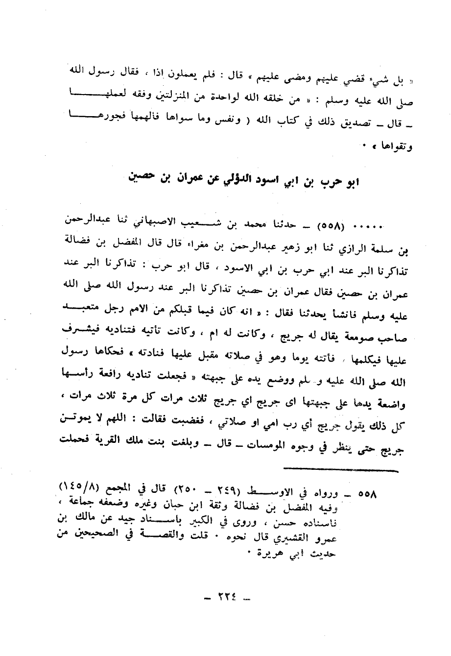 558 - حَدَّثَنَا مُحَمَّدُ بْنُ شُعَيْبٍ الْأَصْبَهَانِيُّ، ثنا عَبْدُ الرَّحْمَنِ بْنُ سَلَمَةَ الرَّازِيُّ، ثنا أَبُو زُهَيْرٍ عَبْدُ الرَّحْمَنِ بْنُ مَغْرَاءَ، قَالَ: قَالَ الْمُفَضَّلُ بْنُ فَضَالَةَ: تَذَاكَرْنَا الْبِرَّ عِنْدَ أَبِي حَرْبِ بْنِ أَبِي الْأَسْوَدِ، قَالَ أَبُو حَرْبٍ: تَذَاكَرْنَا الْبِرَّ عِنْدَ عِمْرَانَ بْنِ حُصَيْنٍ، فَقَالَ عِمْرَانُ بْنُ حُصَيْنٍ: تَذَاكَرْنَا الْبِرَّ عِنْدَ رَسُولِ اللهِ صَلَّى اللهُ عَلَيْهِ وَسَلَّمَ، فَأَنْشَأَ يُحَدِّثُنَا فَقَالَ: " إِنَّهُ §كَانَ فِيمَا قَبْلَكُمْ مِنَ الْأُمَمِ رَجُلٌ مُتَعَبِّدٌ صَاحِبُ صَوْمَعَةٍ يُقَالُ لَهُ جُرَيْجٌ، وَكَانَتْ لَهُ أُمٌّ، وَكَانَتْ تَأْتِيَهِ فَتُنَادِيهِ، فَيُشْرِفُ عَلَيْهَا فَيُكَلِّمُهَا، فَأَتَتْهُ يَوْمًا وَهُوَ فِي صَلَاتِهِ مُقْبِلٌ عَلَيْهَا، فَنَادَتْهُ فَحَكَاهَا رَسُولُ اللهِ صَلَّى اللهُ عَلَيْهِ وَسَلَّمَ، وَوَضَعَ يَدَهُ عَلَى جَبْهَتِهِ، فَجَعَلَتْ تُنَادِيهِ رَافِعَةً رَأْسَهَا، وَاضِعَةً يَدَهَا عَلَى جَبْهَتِهَا: أَيْ جُرَيْجُ، أَيْ جُرَيْجُ ثَلَاثَ مَرَّاتٍ، كُلَّ مَرَّةٍ ثَلَاثَ مَرَّاتٍ، كُلُّ ذَلِكَ يَقُولُ جُرَيْجٌ: أَيْ رَبِّ، أُمِّي أَوْ صَلَاتِي، فَغَضِبَتْ فَقَالَتِ: اللهُمَّ لَا يَمُوتَنَّ جُرَيْجٌ حَتَّى يَنْظُرَ فِي وُجُوهِ الْمُومِسَاتِ، قَالَ: وَبَلَغَتْ بِنْتُ مَلَكِ الْقَرْيَةِ، فَحَمَلَتْ فَوَلَدَتْ غُلَامًا، فَقَالُوا لَهَا: مَنْ فَعَلَ هَذَا بِكِ؟ مَنْ صَاحِبُكِ؟ قَالَتْ: هُوَ صَاحِبُ الصَّوْمَعَةِ جُرَيْجٌ، فَمَا شَعَرَ حَتَّى سَمِعَ بِالْفُؤُوسِ فِي أَصْلِ صَوْمَعَتِهِ، فَجَعَلَ يَسْأَلُهُمْ: وَيْلَكُمْ مَا لَكُمْ؟ فَلَمْ يُجِيبُوهُ فَلَمَّا رَأَى ذَلِكَ أَخَذَ الْحَبْلَ، فَتَدَلَّى، فَجَعَلُوا يَجُرُّونَ أَنْفَهُ، وَيَضْرِبُونَهُ وَيَقُولُونَ: مُرَاءٍ تُخَادِعُ النَّاسَ بِعَمَلِكَ، قَالَ لَهُمْ: وَيْلَكُمْ مَا لَكُمْ؟ قَالُوا: أَنْتَ صَاحِبُ بِنْتِ الْمَلِكِ الَّتِي أَحْبَلْتَهَا؟ قَالَ: فَمَا فَعَلَتْ؟ قَالُوا: وَلَدَتْ غُلَامًا، قَالَ: الْغُلَامُ حَيٌّ هُوَ؟ قَالُوا: نَعَمْ، قَالَ: فَتَوَلُّوا عَنِّي، فَتَوَلُّوا، فَصَلَّى رَكْعَتَيْنِ، ثُمَّ انْتَهَى، ثُمَّ مَشَى إِلَى شَجَرَةٍ فَأَخَذَ مِنْهَا غُصْنًا ثُمَّ أَتَى بِالْغُلَامِ وَهُوَ فِي مَهْدِهِ، فَضَرَبَهُ بِذَلِكَ الْغُصْنِ، وَقَالَ: يَا طَاغِيَةُ مَنْ أَبُوكَ؟ قَالَ: أَبِي فُلَانٌ الرَّاعِي، قَالُوا: إِنْ شِئْتَ بَنَيْنَا لَكَ صَوْمَعَتَكَ بِذَهَبٍ، وَإِنْ شِئْتَ بِفِضَّةٍ، قَالَ: أَعِيدُوهَا كَمَا كَانَتْ " فَزَعَمَ أَبُو حَرْبٍ أَنَّهُ لَمْ يَتَكَلَّمْ فِي الْمَهْدِ إِلَّا ثَلَاثَةٌ: «عِيسَى ابْنُ مَرْيَمَ، وَشَاهِدُ يُوسُفَ، وَصَاحِبُ جُرَيْجٍ»