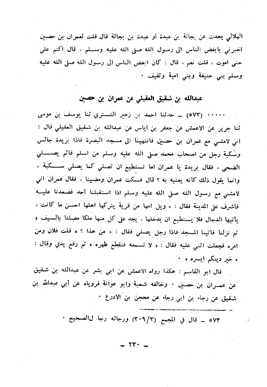 573 - حَدَّثَنَا أَحْمَدُ بْنُ زُهَيْرٍ التُّسْتَرِيُّ، ثنا يُوسُفُ بْنُ مُوسَى، ثنا جَرِيرٌ، عَنِ الْأَعْمَشِ، عَنْ جَعْفَرِ بْنِ إِيَاسٍ، عَنْ عَبْدِ اللهِ بْنِ شَقِيقٍ الْعُقَيْلِيِّ، قَالَ: إِنِّي لَأَمْشِي مَعَ عِمْرَانَ بْنِ حُصَيْنٍ فَانْتَهَيْنَا إِلَى مَسْجِدِ الْبَصْرَةِ، فَإِذَا بُرَيْدَةُ جَالِسٌ وَسُكْبَةُ رَجُلٌ مِنْ أَصْحَابِ مُحَمَّدٍ صَلَّى اللهُ عَلَيْهِ وَسَلَّمَ مِنْ أَسْلَمَ قَائِمٌ يُصَلِّي الضُّحَى، فَقَالَ بُرَيْدَةُ: يَا عِمْرَانُ أَمَا تَسْتَطِيعُ أَنْ تُصَلِّيَ كَمَا يُصَلِّي سُكْبَةُ؟ وَإِنَّمَا يَقُولُ ذَلِكَ كَأَنَّهُ يَعْنِيهِ بِهِ، قَالَ: فَسَكَتَ عِمْرَانُ وَمَضَيْنَا، فَقَالَ عِمْرَانُ: إِنِّي لَأَمْشِي مَعَ رَسُولِ اللهِ صَلَّى اللهُ عَلَيْهِ وَسَلَّمَ إِذِ اسْتَقْبَلْنَا أُحُدًا فَصَعَدْنَا عَلَيْهِ، فَأَشْرَفَ عَلَى الْمَدِينَةِ فَقَالَ: «§وَيْلُ أُمِّهَا مِنْ قَرْيَةٍ يَتْرُكُهَا أَهْلُهَا أَحْسَنَ مَا كَانَتْ، يَأْتِيهَا الدَّجَّالُ فَلَا يَسْتَطِيعُ أَنْ يَدْخُلَهَا، يَجِدُ عَلَى كُلٍّ مِنْهَا مَلَكًا مُصَلَّتًا بِالسَّيْفِ» ثُمَّ نَزَلْنَا