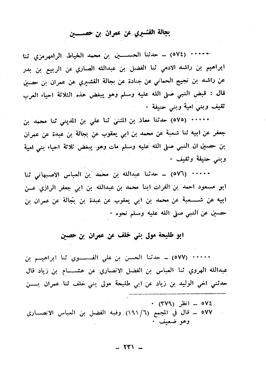 574 - حَدَّثَنَا الْحُسَيْنُ بْنُ مُحَمَّدٍ الْخَيَّاطُ الرَّامَهُرْمُزِيُّ، ثنا إِبْرَاهِيمُ بْنُ رَاشِدٍ الآدَمِيُّ، ثنا الْفَضْلُ بْنُ عَبْدِ اللهِ الصَّارِيُّ، عَنِ الرَّبِيعِ بْنِ بَدْرٍ، عَنْ رَاشِدِ بْنِ نَجِيجٍ الْحِمَّانِيِّ، عَنْ جُنَادَةَ، عَنْ بَجَالَةَ الْقُشَيْرِيِّ، عَنْ عِمْرَانَ بْنِ حُصَيْنٍ قَالَ: " قُبِضَ النَّبِيُّ صَلَّى اللهُ عَلَيْهِ وَسَلَّمَ وَهُوَ §يَبْغَضُ هَذِهِ الثَّلَاثَةَ أَحْيَاءٍ الْعَرَبِ: ثَقِيفًا، وَبَنِي أُمَيَّةَ، وَبَنِي حَنِيفَةَ "