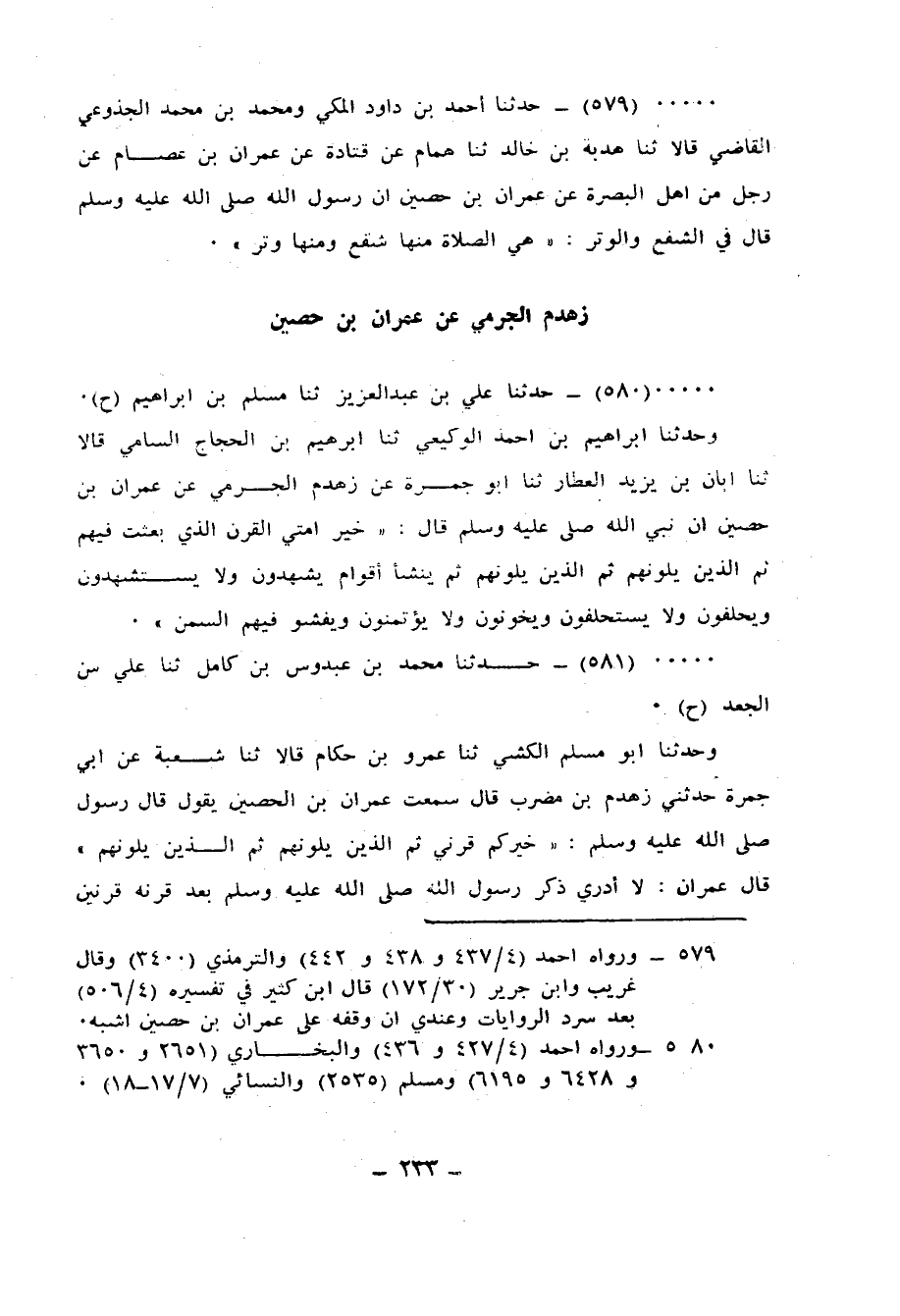 581 - حَدَّثَنَا مُحَمَّدُ بْنُ عَبْدُوسِ بْنِ كَامِلٍ، ثنا عَلِيُّ بْنُ الْجَعْدِ، ح وَحَدَّثَنَا أَبُو مُسْلِمٍ الْكَشِّيُّ، ثنا عَمْرُو بْنُ حَكَّامٍ، قَالَا: ثنا شُعْبَةُ، عَنْ أَبِي جَمْرَةَ، حَدَّثَنِي زَهْدَمُ بْنُ مُضَرِّبٍ قَالَ: سَمِعْتُ عِمْرَانَ بْنِ الْحُصَيْنِ، يَقُولُ: قَالَ رَسُولُ اللهِ صَلَّى اللهُ عَلَيْهِ وَسَلَّمَ: «§خَيْرُكُمْ قَرْنِي ثُمَّ الَّذِينَ يَلُونَهُمْ، ثُمَّ الَّذِينَ يَلُونَهُمْ» قَالَ عِمْرَانُ: لَا أَدْرِي ذَكَرَ رَسُولُ اللهِ صَلَّى اللهُ عَلَيْهِ وَسَلَّمَ: بَعْدَ قَرْنِهِ قَرْنَيْنِ أَوْ ثَلَاثًا، «ثُمَّ يَكُونُ بَعْدَهُمْ قَوْمٌ يَشْهَدُونَ وَلَا يُسْتَشْهَدُونَ، وَيَخُونُونَ وَلَا يُؤْتَمَنُونَ، وَيَقُولُونَ وَلَا يَفُونَ، وَيَظْهَرُ فِيهِمُ السِّمَنُ» وَاللَّفْظُ لِعَمْرِو بْنِ حَكَّامٍ -[234]-،