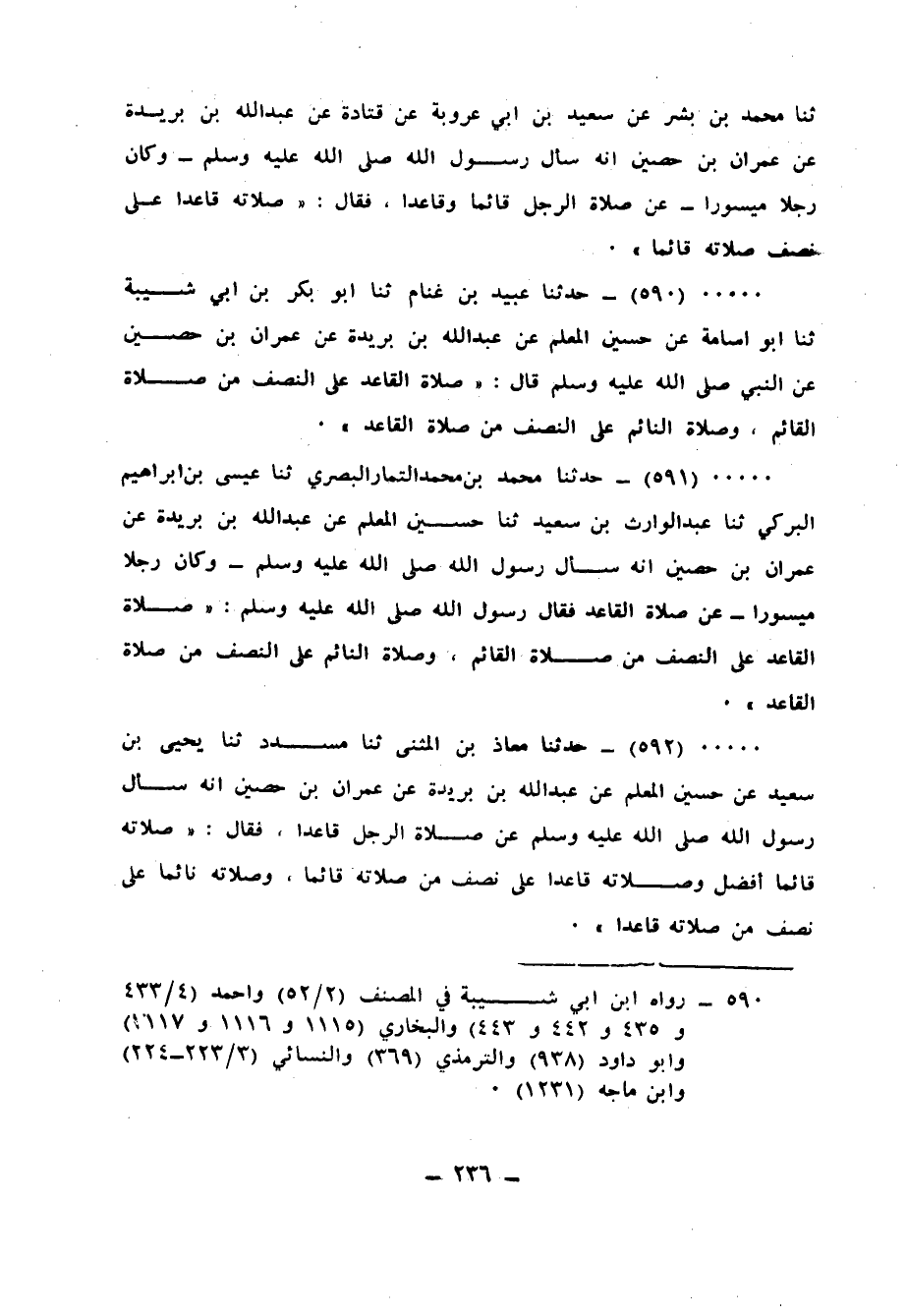 592 - حَدَّثَنَا مُعَاذُ بْنُ الْمُثَنَّى، ثنا مُسَدَّدٌ، ثنا يَحْيَى بْنُ سَعِيدٍ، عَنْ حُسَيْنٍ الْمُعَلِّمِ، عَنْ عَبْدِ اللهِ بْنِ بُرَيْدَةَ، عَنْ عِمْرَانَ بْنِ حُصَيْنٍ، أَنَّهُ سَأَلَ رَسُولَ اللهِ صَلَّى اللهُ عَلَيْهِ وَسَلَّمَ عَنْ صَلَاةِ الرَّجُلِ قَاعِدًا، فَقَالَ: «§صَلَاتُهُ قَائِمًا أَفْضَلُ، وَصَلَاتُهُ قَاعِدًا عَلَى نِصْفٍ مِنْ صَلَاتِهِ قَائِمًا، وَصَلَاتُهُ نَائِمًا عَلَى نِصْفٍ مِنْ صَلَاتِهِ قَاعِدًا»