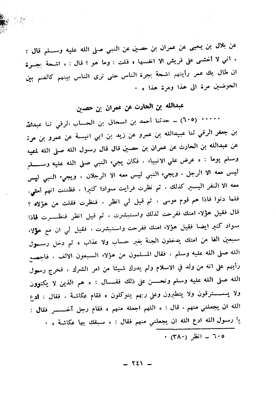 605 - حَدَّثَنَا أَحْمَدُ بْنُ إِسْحَاقَ بْنِ الْحِسَابِ الرَّقِّيُّ، ثنا عَبْدُ اللهِ بْنُ جَعْفَرٍ الرَّقِّيُّ، ثنا عُبَيْدُ اللهِ بْنُ عَمْرٍو، عَنْ زَيْدِ بْنِ أَبِي أُنَيْسَةَ، عَنْ عَمْرِو بْنِ مُرَّةَ، عَنْ عَبْدِ اللهِ بْنِ الْحَارِثِ، عَنْ عِمْرَانَ بْنِ حُصَيْنٍ قَالَ: قَالَ رَسُولُ اللهِ صَلَّى اللهُ عَلَيْهِ وَسَلَّمَ يَوْمًا: " §عُرِضَ عَلِيَّ الْأَنْبِيَاءُ، فَكَانَ يَجِيءُ النَّبِيُّ صَلَّى اللهُ عَلَيْهِ وَسَلَّمَ لَيْسَ مَعَهُ إِلَّا الرَّجُلُ، وَيَجِيءُ النَّبِيُّ لَيْسَ مَعَهُ إِلَّا الرَّجُلَانِ، وَيَجِيءُ النَّبِيُّ لَيْسَ مَعَهُ إِلَّا النَّفْرُ الْيَسِيرُ كَذَلِكَ، ثُمَّ نَظَرْتُ فَرَأَيْتُ سَوَادًا كَثِيرًا، فَظَنَنْتُ أَنَّهُمْ أُمَّتِي فَلَمَّا دَنَوْا، فَإِذَا هُمْ قَوْمُ مُوسَى، ثُمَّ قِيلَ لِي: انْظُرْ فَنَظَرْتُ فَقُلْتُ: مَنْ هَؤُلَاءِ؟ قَالَ: فَقِيلَ هَؤُلَاءِ أُمَّتُكَ فَفَرِحْتُ لِذَلِكَ، وَاسْتَبْشَرْتُ ثُمَّ قِيلَ: انْظُرْ فَنَظَرْتُ، فَإِذَا سَوَادٌ كَثِيرٌ أَيْضًا، فَقِيلَ: هَؤُلَاءِ أُمَّتُكَ فَفَرِحْتُ وَاسْتَبْشَرْتُ، فَقِيلَ لِي: إِنَّ مَعَ هَؤُلَاءِ سَبْعِينَ أَلْفًا مِنْ أُمَّتِكَ يَدْخُلُونَ الْجَنَّةَ بِغَيْرِ حِسَابٍ وَلَا عَذَابٍ " ثُمَّ دَخَلَ رَسُولُ اللهِ صَلَّى اللهُ عَلَيْهِ وَسَلَّمَ فَقَالَ الْمُسْلِمُونَ: مَنْ هَؤُلَاءِ السَّبْعُونَ الْأَلْفَ؟ فَأَجْمَعَ رَأْيِهِمْ عَلَى أَنَّهُ مَنْ وُلِدَ فِي الْإِسْلَامِ وَلَمْ يُدْرِكْ شَيْئًا مِنْ أَمْرِ الشِّرْكِ، فَخَرَجَ رَسُولُ اللهِ صَلَّى اللهُ عَلَيْهِ وَسَلَّمَ وَنَحْنُ عَلَى ذَلِكَ فَقَالَ: «هُمُ الَّذِينَ لَا يَكْتَوُونَ وَلَا يَسْتَرْقُونَ وَلَا يَتَطَيَّرُونَ وَعَلَى رَبِّهِمْ يَتَوَكَّلُونَ» فَقَامَ عُكَّاشَةُ فَقَالَ: ادْعُ اللهَ أَنْ يَجْعَلَنِي مِنْهُمْ، قَالَ: «اللهُمَّ اجْعَلْهُ مِنْهُمْ» فَقَامَ رَجُلٌ آخَرُ فَقَالَ: يَا رَسُولَ اللهِ، ادْعُ اللهَ أَنْ يَجْعَلَنِي مِنْهُمْ، فَقَالَ: «سَبَقَكَ بِهَا عُكَّاشَةُ»