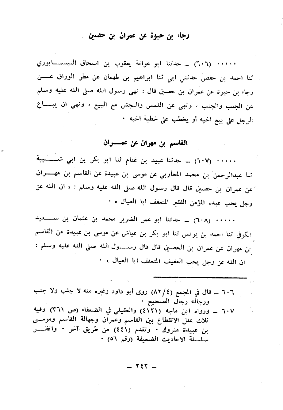 608 - حَدَّثَنَا أَبُو عُمَرَ الضَّرِيرُ مُحَمَّدُ بْنُ عُثْمَانَ بْنِ سَعِيدٍ الْكُوفِيُّ، ثنا أَحْمَدُ بْنُ يُونُسَ، ثنا أَبُو بَكْرِ بْنُ عَيَّاشٍ، عَنْ مُوسَى بْنِ عُبَيْدَةَ، عَنِ الْقَاسِمِ بْنِ مِهْرَانَ، عَنْ عِمْرَانَ بْنِ الْحُصَيْنِ قَالَ: قَالَ رَسُولُ اللهِ صَلَّى اللهُ عَلَيْهِ وَسَلَّمَ: «إِنَّ §اللهَ عَزَّ وَجَلَّ يُحِبُّ الْعَفِيفَ الْمُتَعَفِّفَ أَبَا الْعِيَالِ»