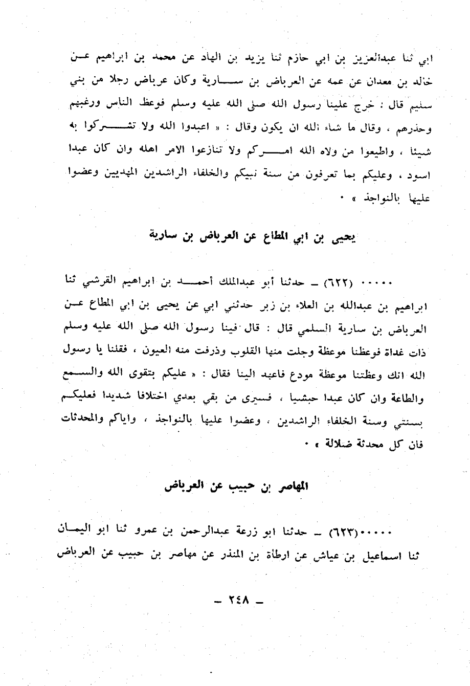 623 - حَدَّثَنَا أَبُو زُرْعَةَ عَبْدُ الرَّحْمَنِ بْنُ عَمْرٍو، ثنا أَبُو الْيَمَانِ، ثنا إِسْمَاعِيلُ بْنُ عَيَّاشٍ، عَنْ أَرْطَاةَ بْنِ الْمُنْذِرِ، عَنْ مهاصرِ بْنِ حَبِيبٍ، عَنِ الْعِرْبَاضِ بْنِ سَارِيَةَ قَالَ: وَعَظَنَا رَسُولُ اللهِ صَلَّى اللهُ عَلَيْهِ وَسَلَّمَ بَعْدَ صَلَاةِ الْغَدَاةِ مَوْعِظَةً بَلِيغَةً ذَرَفَتْ مِنْهَا الْعُيُونُ، وَوَجِلَتْ مِنْهَا الْقُلُوبُ، فَقَالَ رَجُلٌ مِنْ أَصْحَابِهِ: يَا رَسُولَ اللهِ، إِنَّ هَذِهِ مَوْعِظَةَ مُوَدِّعٍ، فَقَالَ: «§أُوصِيكُمْ بِتَقْوَى اللهِ، وَالسَّمْعِ وَالطَّاعَةِ وَإِنْ كَانَ عَبْدًا حَبَشِيًّا، فَإِنَّهُ مَنْ يَعِشْ مِنْكُمْ فَسَيَرَى اخْتِلَافًا كَثِيرًا، فَإِيَّاكُمْ وَمُحْدَثَاتِ الْأُمُورِ فَإِنَّهَا بِدْعَةٌ، فَمَنْ أَدْرَكَ ذَلِكَ مِنْكُمْ فَعَلَيْهِ بِسُنَّتِي، وَسُنَّةِ الْخُلَفَاءِ الرَّاشِدِينَ الْمَهْدِيِّينَ، عَضُّوا عَلَيْهَا بِالنَّوَاجِذِ»