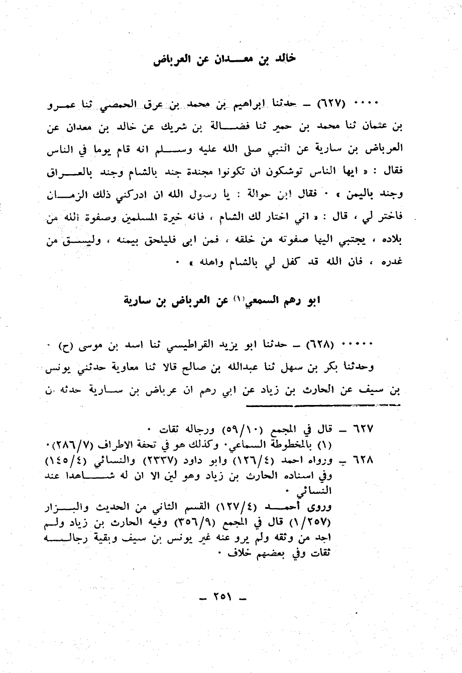 627 - حَدَّثَنَا إِبْرَاهِيمُ بْنُ مُحَمَّدِ بْنِ عِرْقٍ الْحِمْصِيُّ، ثنا عَمْرُو بْنُ عُثْمَانَ، ثنا مُحَمَّدُ بْنُ حِمْيَرٍ، ثنا فَضَالَةُ بْنُ شَرِيكٍ، عَنْ خَالِدِ بْنِ مَعْدَانَ، عَنِ الْعِرْبَاضِ بْنِ سَارِيَةَ، عَنِ النَّبِيِّ صَلَّى اللهُ عَلَيْهِ وَسَلَّمَ أَنَّهُ قَامَ يَوْمًا فِي النَّاسِ فَقَالَ: «أَيُّهَا النَّاسُ، §تُوشِكُونَ أَنْ تَكُونُوا مُجَنَّدَةً، جُنْدٌ بِالشَّامِ، وَجُنْدٌ بِالْعِرَاقِ، وَجُنْدٌ بِالْيَمَنِ» فَقَالَ ابْنُ حَوَالَةَ: يَا رَسُولَ اللهِ، إِنْ أَدْرَكَنِي ذَلِكَ الزَّمَانُ فَاخْتَرْ لِي، قَالَ: «إِنِّي أَخْتَارُ لَكَ الشَّامَ، فَإِنَّهُ خِيْرَةُ الْمُسْلِمِينَ وَصَفْوَةُ اللهِ مِنْ بِلَادِهِ، يَجْتَبِي إِلَيْهَا صَفْوَتَهُ مِنْ خَلْقِهِ، فَمَنْ أَبَى فَلْيَلْحَقْ بِيَمَنِهِ، وَلْيَسْقِ مِنْ غُدُرِهِ، فَإِنَّ اللهَ قَدْ كَفَلَ لِي بِالشَّامِ وَأَهْلِهِ»