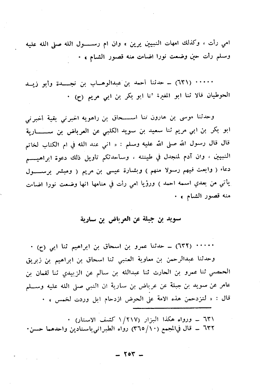 631 - حَدَّثَنَا أَحْمَدُ بْنُ عَبْدِ الْوَهَّابِ بْنِ نَجْدَةَ، وَأَبُو زَيْدٍ الْحَوْطِيَّانِ قَالَا: ثنا أَبُو الْمُغِيرَةِ، ثنا أَبُو بَكْرِ بْنُ أَبِي مَرْيَمَ، ح وَحَدَّثَنَا مُوسَى بْنُ هَارُونَ، ثنا إِسْحَاقُ بْنُ رَاهَوَيْهِ، أَخْبَرَنِي بَقِيَّةُ، أَخْبَرَنِي أَبُو بَكْرِ بْنُ أَبِي مَرْيَمَ، ثنا سَعِيدُ بْنُ سُوَيْدٍ الْكَلْبِيُّ، عَنِ الْعِرْبَاضِ بْنِ سَارِيَةَ قَالَ: قَالَ رَسُولُ اللهِ صَلَّى اللهُ عَلَيْهِ وَسَلَّمَ: " §إِنِّي عِنْدَ اللهِ فِي أُمِّ الْكِتَابِ لَخَاتَمُ النَّبِيِّنَ، وَإِنَّ آدَمَ لَمُنْجَدِلٌ فِي طِينَتِهِ، وَسَأُحَدِّثُكُمْ تَأْوِيلَ ذَلِكَ دَعْوَةُ إِبْرَاهِيمَ، دُعَاءُ {وَابْعَثْ فِيهِمْ رَسُولًا مِنْهُمْ} [البقرة: 129] ، وَبِشَارَةُ عِيسَى بْنِ مَرْيَمَ {وَمُبَشِّرًا بِرَسُولٍ يَأْتِي مِنْ بَعْدِي اسْمُهُ أَحْمَدُ} [الصف: 6] ، وَرُؤْيَا أُمِّي رَأَتْ فِي مَنَامِهَا أَنَّهَا وَضَعَتْ نُورًا أَضَاءَتْ مِنْهُ قُصُورَ الشَّامِ "