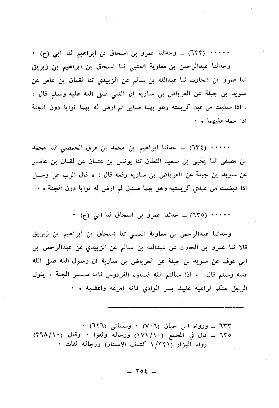 633 - وَحَدَّثَنَا عَمْرُو بْنُ إِسْحَاقَ بْنِ إِبْرَاهِيمَ، ثنا أَبِي ح وَحَدَّثَنَا عَبْدُ الرَّحْمَنِ بْنُ مُعَاوِيَةَ الْعُتْبِيُّ، ثنا إِسْحَاقُ بْنُ إِبْرَاهِيمَ بْنِ زِبْرِيقٍ، ثنا عَمْرُو بْنُ الْحَارِثِ، ثنا عَبْدُ اللهِ بْنُ سَالِمٍ، عَنِ الزُّبَيْدِيِّ، ثنا لُقْمَانُ بْنُ عَامِرٍ، عَنْ سُوَيْدِ بْنِ جَبَلَةَ، عَنِ الْعِرْبَاضِ بْنِ سَارِيَةَ، أَنَّ النَّبِيَّ صَلَّى اللهُ عَلَيْهِ وَسَلَّمَ قَالَ: «§إِذَا سَلَبْتُ مِنْ عَبْدٍ كَرِيمَتَيْهِ، وَهُوَ بِهِمَا صَابِرٌ لَمْ أَرْضَ لَهُ بِهِمَا ثَوَابًا دُونَ الْجَنَّةِ إِذَا حَمِدَ عَلَيْهِمَا»