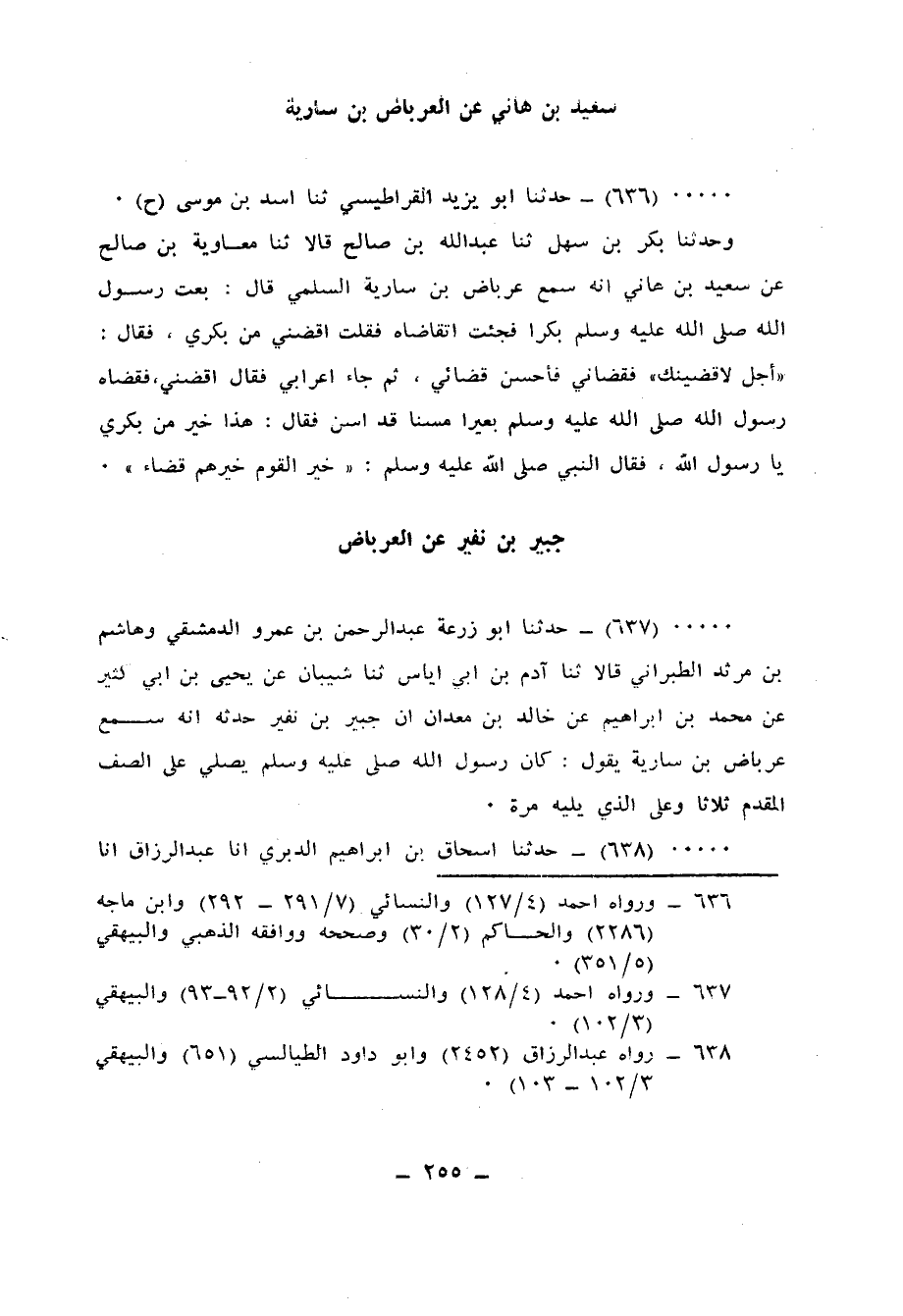 636 - حَدَّثَنَا أَبُو يَزِيدَ الْقَرَاطِيسِيُّ، ثنا أَسَدُ بْنُ مُوسَى، ح وَحَدَّثَنَا بَكْرُ بْنُ سَهْلٍ، ثنا عَبْدُ اللهِ بْنُ صَالِحٍ، قَالَا: ثنا مُعَاوِيَةُ بْنُ صَالِحٍ، عَنْ سَعِيدِ بْنِ هَانِي، أَنَّهُ سَمِعَ عِرْبَاضَ بْنَ سَارِيَةَ السُّلَمِيَّ قَالَ: بِعْتُ رَسُولَ اللهِ صَلَّى اللهُ عَلَيْهِ وَسَلَّمَ بِكْرًا، فَجِئْتُ أَتَقَاضَاهُ فَقُلْتُ: اقْضِنِي مِنْ بِكْرِي، فَقَالَ: «أَجَلْ لَأَقْضِيَنَّكَ» فَقَضَانِي فَأَحْسَنَ قَضَائِي، ثُمَّ جَاءَ أَعْرَابِيٌّ فَقَالَ: اقْضِنِي، فَقَضَاهُ رَسُولُ اللهِ صَلَّى اللهُ عَلَيْهِ وَسَلَّمَ بَعِيرًا مُسِنًّا قَدْ أَسَنَّ فَقَالَ: هَذَا خَيْرٌ مِنْ بَكْرِي يَا رَسُولَ اللهِ، فَقَالَ النَّبِيُّ صَلَّى اللهُ عَلَيْهِ وَسَلَّمَ: «§خَيْرُ الْقَوْمِ خَيْرُهُمْ قَضَاءً»