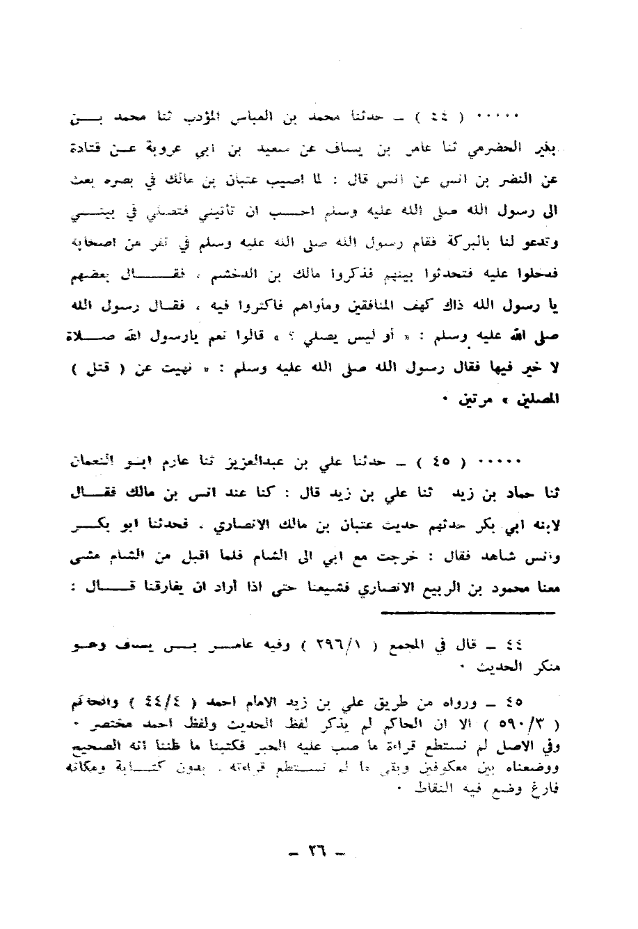44 - حَدَّثَنَا مُحَمَّدُ بْنُ الْعَبَّاسِ الْمُؤَدِّبُ، ثنا مُحَمَّدُ بْنُ بُكَيْرٍ الْحَضْرَمِيُّ، ثنا عَامِرُ بْنُ يَسَافَ، عَنْ سَعِيدِ بْنِ أَبِي عَرُوبَةَ، عَنْ قَتَادَةَ، عَنِ النَّضْرِ بْنِ أَنَسٍ، عَنْ أَنَسٍ قَالَ: لَمَّا أُصِيبَ عِتْبَانُ بْنُ مَالِكٍ فِي بَصَرِهِ، بَعَثَ إِلَى رَسُولِ اللهِ صَلَّى اللهُ عَلَيْهِ وَسَلَّمَ، أُحِبُّ أَنْ تَأْتِيَنِي فَتُصَلِّيَ فِي بَيْتِي، وَتَدْعُوَ لَنَا بِالْبَرَكَةِ، فَقَامَ رَسُولُ اللهِ صَلَّى اللهُ عَلَيْهِ وَسَلَّمَ فِي نَفَرٍ مِنْ أَصْحَابِهِ فَدَخَلُوا عَلَيْهِ، فَتَحَدَّثُوا بَيْنَهُمْ فَذَكَرُوا مَالِكَ بْنَ الدُّخْشُمِ فَقَالَ بَعْضُهُمْ: يَا رَسُولَ اللهِ، ذَاكَ كَهْفُ الْمُنَافِقِينَ وَمَأْوَاهُمْ، فَأَكْثَرُوا فِيهِ، فَقَالَ رَسُولُ اللهِ صَلَّى اللهُ عَلَيْهِ وَسَلَّمَ: «أَوَلَيْسَ يُصَلِّي؟» قَالُوا: نَعَمْ يَا رَسُولَ اللهِ، صَلَاةً لَا خَيْرَ فِيهَا، فَقَالَ رَسُولُ اللهِ صَلَّى اللهُ عَلَيْهِ وَسَلَّمَ: «§نَهَيْتُ عَنْ قَتْلِ الْمُصَلِّينَ» ، مَرَّتَيْنِ