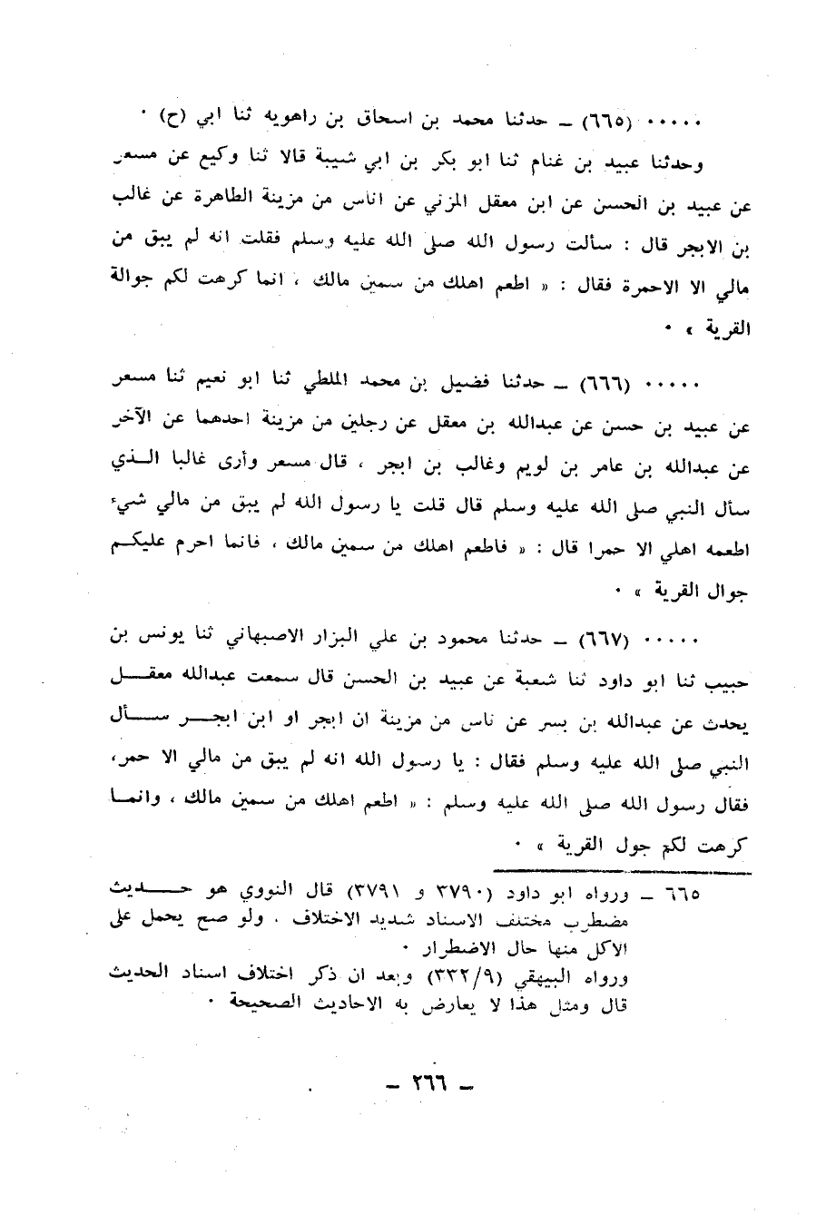 666 - حَدَّثَنَا فُضَيْلُ بْنُ مُحَمَّدٍ الْمَلْطِيُّ، ثنا أَبُو نُعَيْمٍ، ثنا مِسْعَرٌ، عَنْ عُبَيْدِ بْنِ حَسَنٍ، عَنْ عَبْدِ اللهِ بْنِ مَعْقِلٍ، عَنْ رَجُلَيْنِ مِنْ مُزَيْنَةَ أَحَدُهُمَا، عَنِ الْآخَرِ، عَنْ عَبْدِ اللهِ بْنِ عَامِرِ بْنِ لُوَيْمٍ، وَغَالِبِ بْنِ أَبْجَرَ، - قَالَ مِسْعَرٌ: وَأَرَى غَالِبًا الَّذِي سَأَلَ النَّبِيَّ صَلَّى اللهُ عَلَيْهِ وَسَلَّمَ -، قَالَ: قُلْتُ يَا رَسُولَ اللهِ، لَمْ يَبْقَ مِنْ مَالِي شَيْءٌ أُطْعِمُهُ أَهْلِي إِلَّا حُمُرًا، قَالَ: «§فَأَطْعِمْ أَهْلَكَ مِنْ سَمِينِ مَالِكَ، فَإِنَّمَا أُحَرِّمُ عَلَيْكُمْ جَوَّالَ الْقَرْيَةِ»
