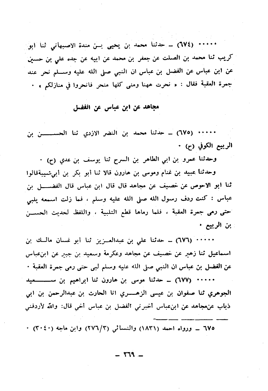 675 - حَدَّثَنَا مُحَمَّدُ بْنُ النَّضْرِ الْأَزْدِيُّ، ثنا الْحَسَنُ بْنُ الرَّبِيعِ الْكُوفِيُّ، ح وَحَدَّثَنَا عَمْرُو بْنُ أَبِي الطَّاهِرِ بْنِ السَّرْحِ، ثنا يُوسُفُ بْنُ عَدِيٍّ، ح وَحَدَّثَنَا عُبَيْدُ بْنُ غَنَّامٍ، وَمُوسَى بْنُ هَارُونَ، قَالَا: ثنا أَبُو بَكْرِ بْنُ أَبِي شَيْبَةَ، قَالُوا: ثنا أَبُو الْأَحْوَصِ، عَنْ خُصَيْفٍ، عَنْ مُجَاهِدٍ، قَالَ: قَالَ ابْنُ عَبَّاسٍ: قَالَ الْفَضْلُ بْنُ عَبَّاسٍ: «كُنْتُ رِدْفَ رَسُولِ اللهِ صَلَّى اللهُ عَلَيْهِ وَسَلَّمَ، فَمَا زِلْتُ أَسْمَعْهُ §يُلَبِّي حَتَّى رَمَى جَمْرَةَ الْعَقَبَةِ، فَلَمَّا رَمَاهَا قَطَعَ التَّلْبِيَةَ» وَاللَّفْظُ لِحَدِيثِ الْحَسَنِ بْنِ الرَّبِيعِ