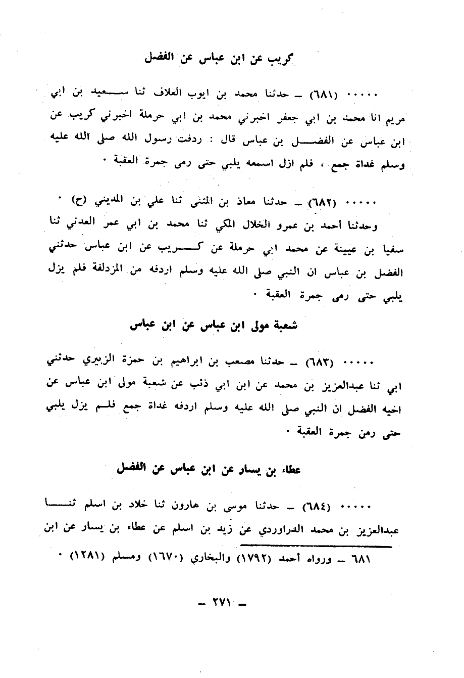 684 - حَدَّثَنَا مُوسَى بْنُ هَارُونَ، ثنا خَلَّادُ بْنُ أَسْلَمَ، ثنا عَبْدُ الْعَزِيزِ بْنُ مُحَمَّدٍ الدَّرَاوَرْدِيُّ، عَنْ زَيْدِ بْنِ أَسْلَمَ، عَنْ عَطَاءِ بْنِ يَسَارٍ، عَنِ ابْنِ عَبَّاسٍ، عَنِ الْفَضْلِ بْنِ عَبَّاسٍ قَالَ: «رَدِفْتُ خَلْفَ رَسُولِ اللهِ صَلَّى اللهُ عَلَيْهِ وَسَلَّمَ غَدَاةَ جَمْعٍ، فَلَمْ يَزَلْ §يُلَبِّي حَتَّى رَمَى جَمْرَةَ الْعَقَبَةِ»