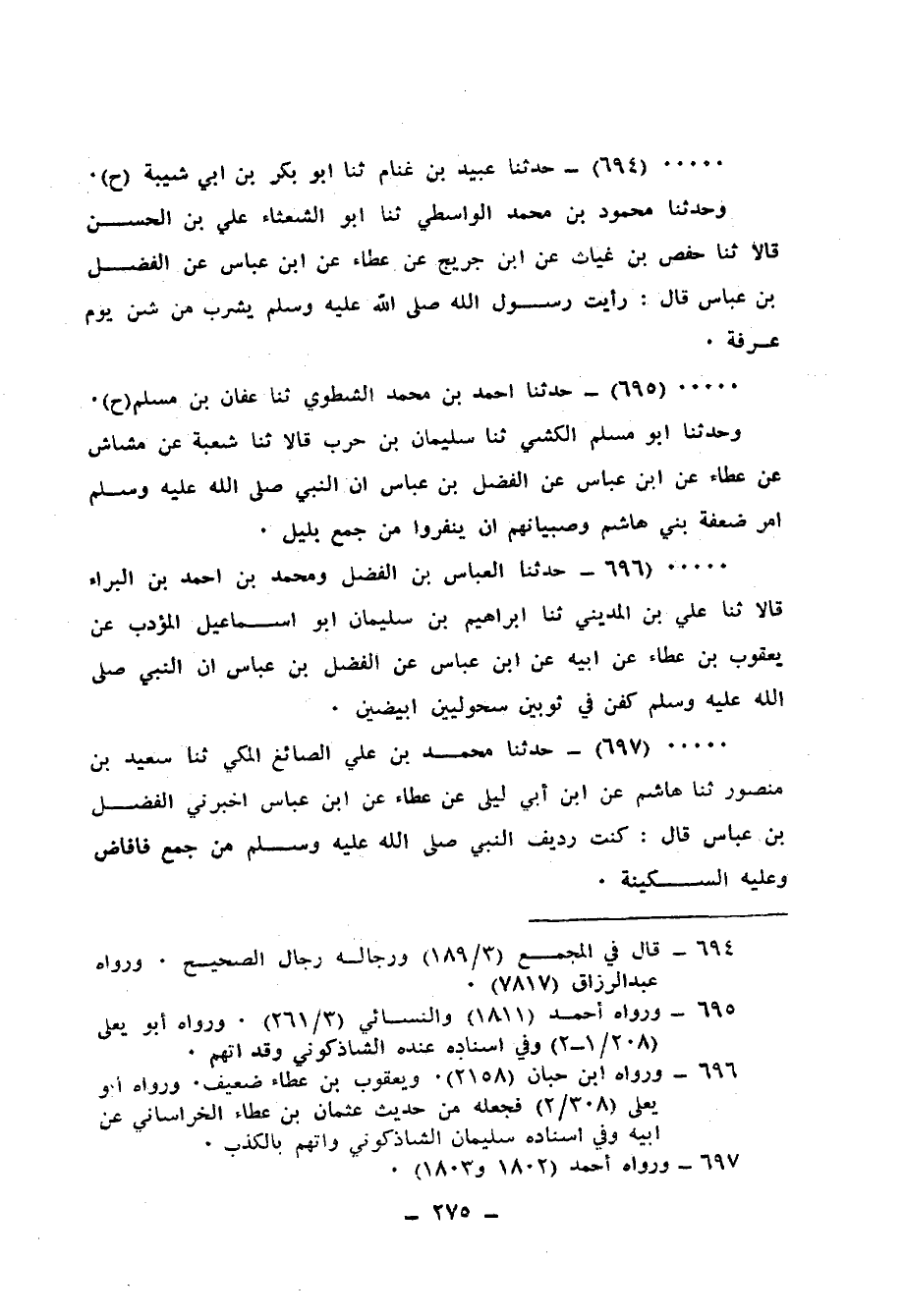697 - حَدَّثَنَا مُحَمَّدُ بْنُ عَلِيٍّ الصَّائِغُ الْمَكِّيُّ، ثنا سَعِيدُ بْنُ مَنْصُورٍ، ثنا هَاشِمٌ، عَنِ ابْنِ أَبِي لَيْلَى، عَنْ عَطَاءٍ، عَنِ ابْنِ عَبَّاسٍ، أَخْبَرَنِي الْفَضْلُ بْنُ عَبَّاسٍ قَالَ: «كُنْتُ رَدِيفَ النَّبِيِّ صَلَّى اللهُ عَلَيْهِ وَسَلَّمَ مِنْ جَمْعٍ §فَأَفَاضَ وَعَلَيْهِ السَّكِينَةُ»