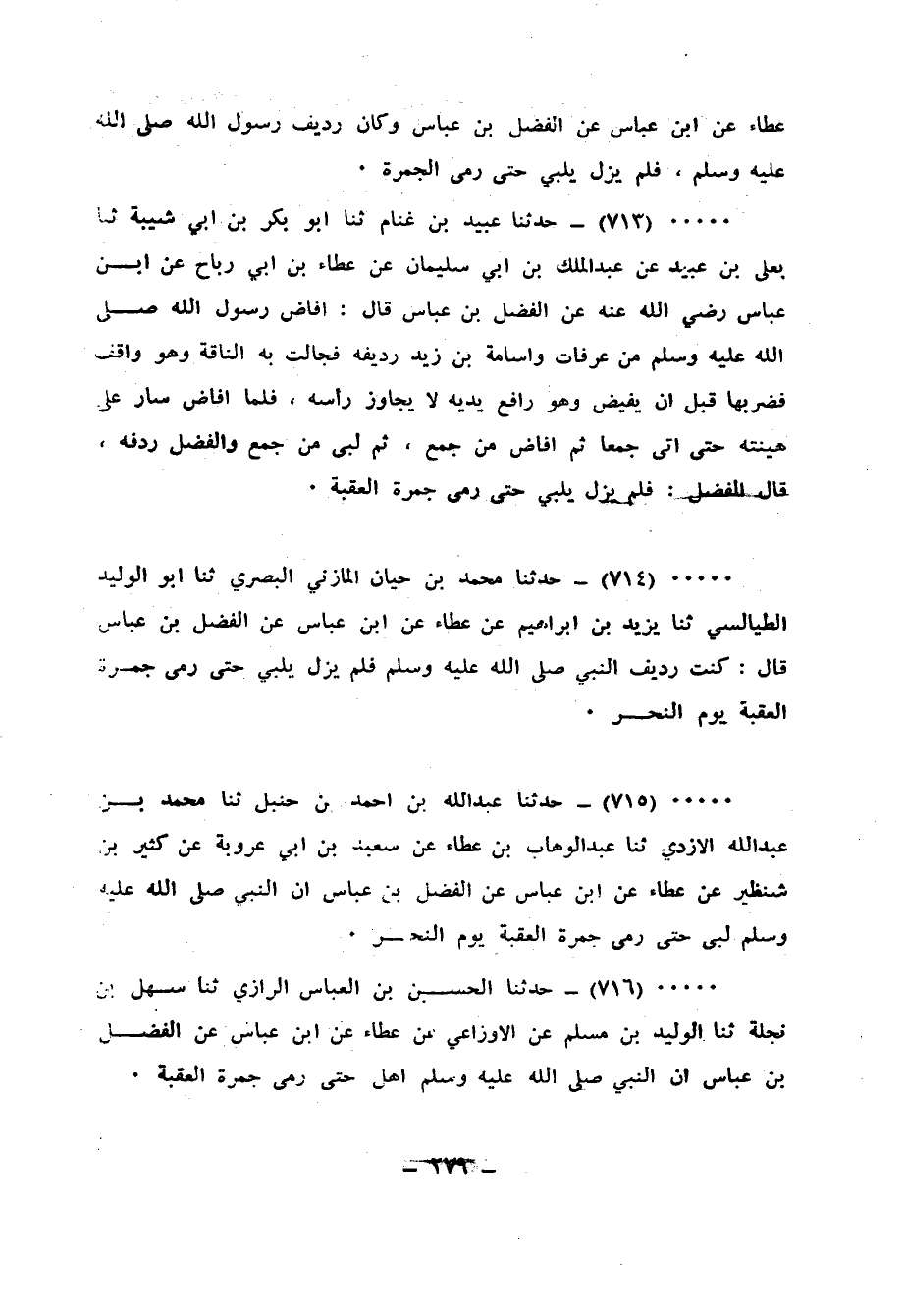 714 - حَدَّثَنَا مُحَمَّدُ بْنُ حَيَّانَ الْمَازِنِيُّ الْبَصْرِيُّ، ثنا أَبُو الْوَلِيدِ الطَّيَالِسِيُّ، ثنا يَزِيدُ بْنُ إِبْرَاهِيمَ، عَنْ عَطَاءٍ، عَنِ ابْنِ عَبَّاسٍ، عَنِ الْفَضْلِ بْنِ عَبَّاسٍ قَالَ: «كُنْتُ رَدِيفَ النَّبِيِّ صَلَّى اللهُ عَلَيْهِ وَسَلَّمَ فَلَمْ يَزَلْ §يُلَبِّي حَتَّى رَمَى جَمْرَةَ الْعَقَبَةِ يَوْمَ النَّحْرِ»