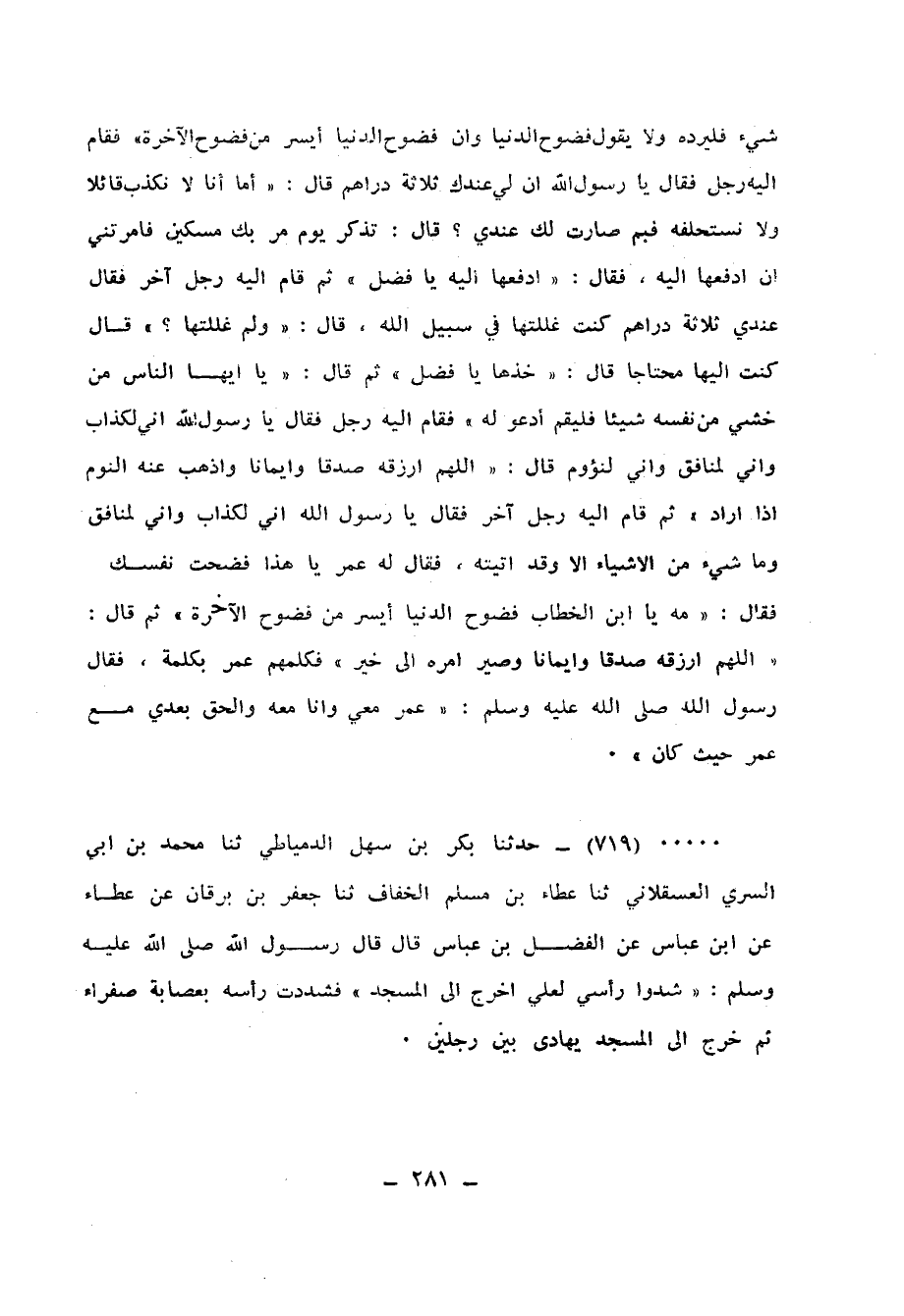 719 - حَدَّثَنَا بَكْرُ بْنُ سَهْلٍ الدِّمْيَاطِيُّ، ثنا مُحَمَّدُ بْنُ أَبِي السَّرِيِّ الْعَسْقَلَانِيُّ، ثنا عَطَاءُ بْنُ مُسْلِمٍ الْخَفَّافُ، ثنا جَعْفَرُ بْنُ بُرْقَانَ، عَنْ عَطَاءٍ، عَنِ ابْنِ عَبَّاسٍ، عَنِ الْفَضْلِ بْنِ عَبَّاسٍ قَالَ: قَالَ رَسُولُ اللهِ صَلَّى اللهُ عَلَيْهِ وَسَلَّمَ: «§شُدُّوا رَأْسِي لِعَلِّي أَخْرَجُ إِلَى الْمَسْجِدِ» فَشَدَدْتُ رَأْسَهُ بِعِصَابَةٍ صَفْرَاءَ، ثُمَّ خَرَجَ إِلَى الْمَسْجِدِ يُهَادَى بَيْنِ رَجُلَيْنِ