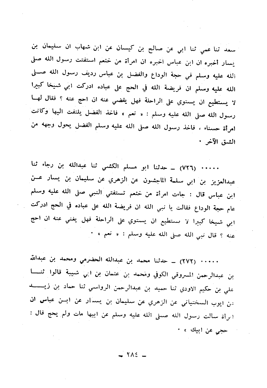 727 - حَدَّثَنَا مُحَمَّدُ بْنُ عَبْدِ اللهِ الْحَضْرَمِيُّ، وَمُحَمَّدُ بْنُ عَبْدِ اللهِ بْنِ عَبْدِ الرَّحْمَنِ الْمَسْرُوقِيُّ الْكُوفِيُّ، وَمُحَمَّدُ بْنُ عُثْمَانَ بْنِ أَبِي شَيْبَةَ، قَالُوا: ثنا عَلِيُّ بْنُ حَكِيمٍ الْأَوْدِيُّ، ثنا حُمَيْدُ بْنُ عَبْدِ الرَّحْمَنِ الرُّوَاسِيُّ، ثنا حَمَّادُ بْنُ زَيْدٍ، عَنْ أَيُّوبَ السَّخْتِيَانِيِّ، عَنِ الزُّهْرِيِّ، عَنْ سُلَيْمَانَ بْنِ يَسَارٍ، عَنِ ابْنِ عَبَّاسٍ، أَنَّ امْرَأَةً سَأَلَتْ رَسُولَ اللهِ صَلَّى اللهُ عَلَيْهِ وَسَلَّمَ عَنْ أَبِيهَا مَاتَ وَلَمْ يَحُجَّ قَالَ: «§حُجِّي عَنْ أَبِيكِ»