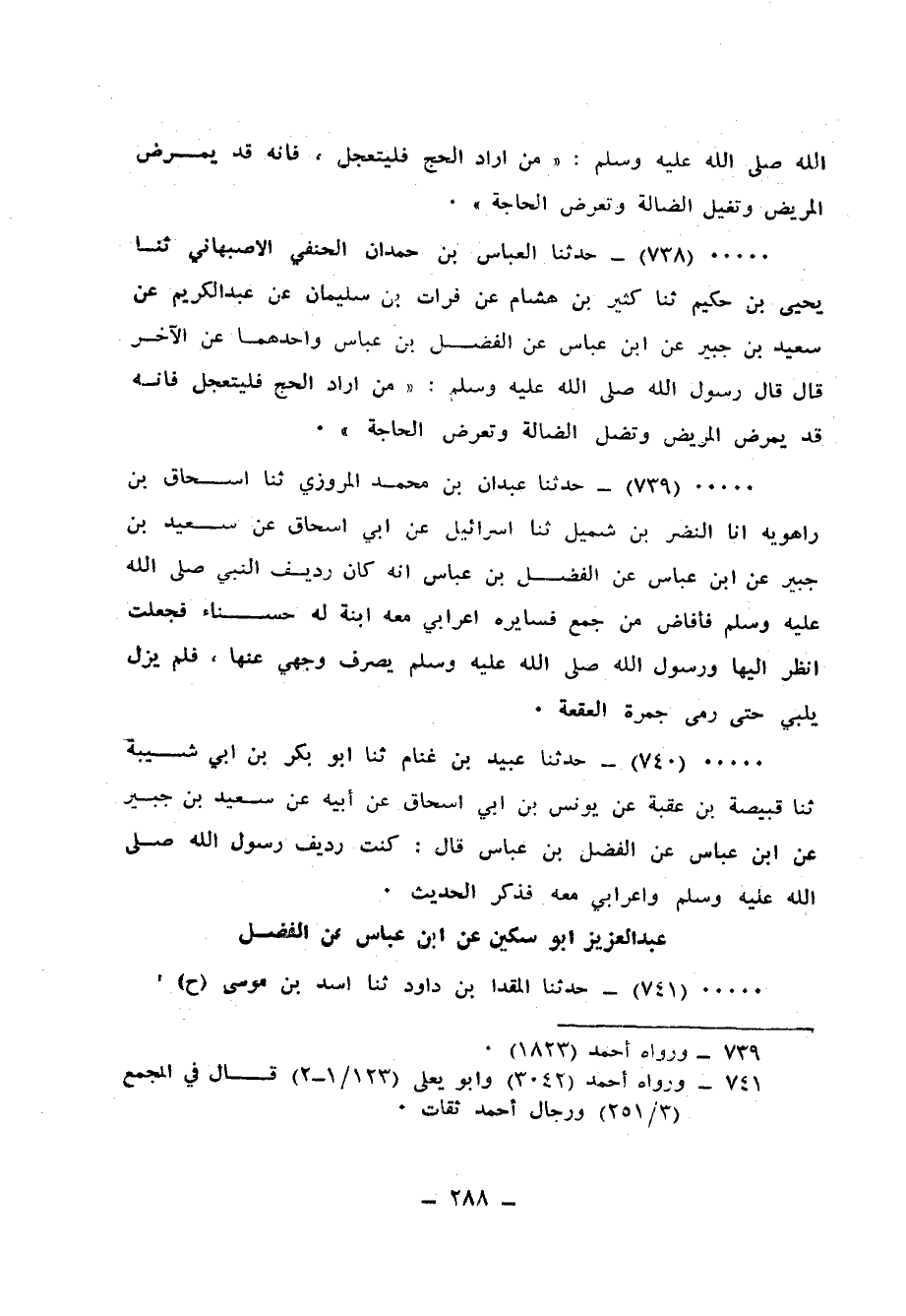 739 - حَدَّثَنَا عَبْدَانُ بْنُ مُحَمَّدٍ الْمَرْوَزِيُّ، ثنا إِسْحَاقُ بْنُ رَاهَوَيْهِ، أَنَا النَّضْرُ بْنُ شُمَيْلٍ، ثنا إِسْرَائِيلُ، عَنِ ابْنِ إِسْحَاقَ، عَنْ سَعِيدِ بْنِ جُبَيْرٍ، عَنِ ابْنِ عَبَّاسٍ، عَنِ الْفَضْلِ بْنِ عَبَّاسٍ: أَنَّهُ كَانَ رَدِيفَ النَّبِيِّ صَلَّى اللهُ عَلَيْهِ وَسَلَّمَ، فَأَفَاضَ مِنْ جَمْعٍ، فَسَايَرَهُ أَعْرَابِيٌّ مَعَهُ ابْنَةٌ لَهُ حَسْنَاءُ، فَجَعَلْتُ أَنْظُرُ إِلَيْهَا، وَرَسُولُ اللهِ صَلَّى اللهُ عَلَيْهِ وَسَلَّمَ يَصْرِفُ وَجْهِي عَنْهَا، فَلَمْ يَزَلْ §يُلَبِّي حَتَّى رَمَى جَمْرَةَ الْعَقَبَةِ "