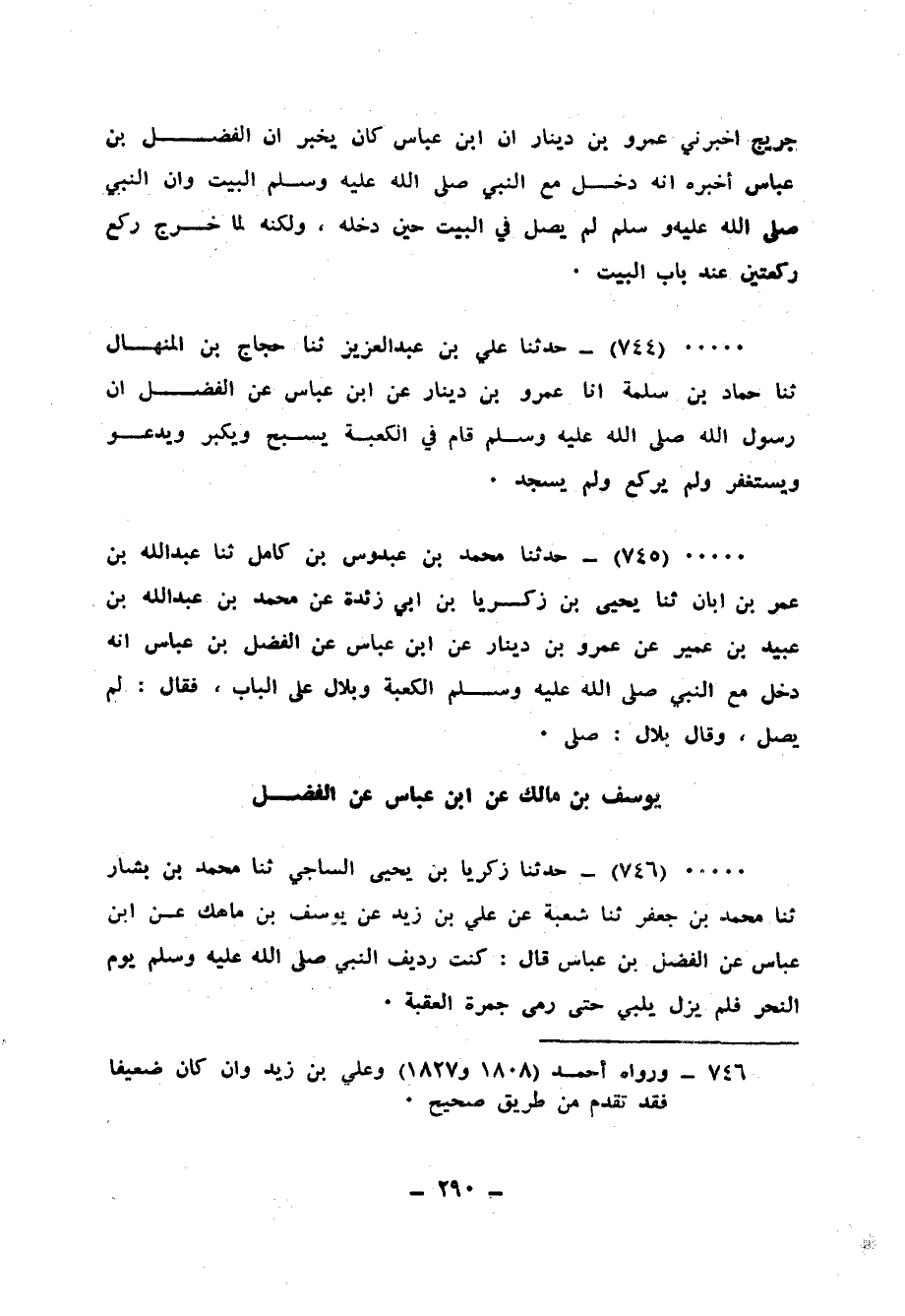 745 - حَدَّثَنَا مُحَمَّدُ بْنُ عَبْدُوسِ بْنِ كَامِلٍ، ثنا عَبْدُ اللهِ بْنُ عُمَرَ بْنِ أَبَانَ، ثنا يَحْيَى بْنُ زَكَرِيَّا بْنِ أَبِي زَائِدَةَ، عَنْ مُحَمَّدِ بْنِ عَبْدِ اللهِ بْنِ عُبَيْدِ بْنِ عُمَيْرٍ، عَنْ عَمْرِو بْنِ دِينَارٍ، عَنِ ابْنِ عَبَّاسٍ، عَنِ الْفَضْلِ بْنِ عَبَّاسٍ: «أَنَّهُ §دَخَلَ مَعَ النَّبِيِّ صَلَّى اللهُ عَلَيْهِ وَسَلَّمَ الْكَعْبَةَ، وَبِلَالٌ عَلَى الْبَابِ» فَقَالَ: «لَمْ يُصَلِّ» ، وَقَالَ بِلَالٌ: «صَلَّى»