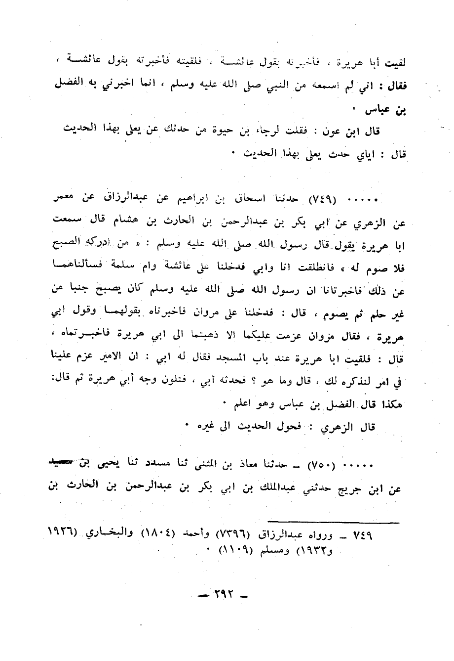 749 - حَدَّثَنَا إِسْحَاقُ بْنُ إِبْرَاهِيمَ، عَنْ عَبْدِ الرَّزَّاقِ، عَنْ مَعْمَرٍ، عَنِ الزُّهْرِيِّ، عَنْ أَبِي بَكْرِ بْنِ عَبْدِ الرَّحْمَنِ بْنِ الْحَارِثِ بْنِ هِشَامٍ، قَالَ: سَمِعْتُ أَبَا هُرَيْرَةَ يَقُولُ: قَالَ رَسُولُ اللهِ صَلَّى اللهُ عَلَيْهِ وَسَلَّمَ: «مَنْ أَدْرَكَهُ الصُّبْحُ فَلَا صَوْمَ لَهُ» فَانْطَلَقْتُ أَنَا وَأَبِي فَدَخَلْنَا عَلَى عَائِشَةَ، وَأُمِّ سَلَمَةَ، فَسَأَلْنَاهُمَا عَنْ ذَلِكَ فَأَخْبَرَتَانَا، «أَنَّ رَسُولَ اللهِ صَلَّى اللهُ عَلَيْهِ وَسَلَّمَ كَانَ §يُصْبِحُ جُنُبًا مِنْ غَيْرِ حُلُمٍ ثُمَّ يَصُومُ» قَالَ: فَدَخَلْنَا عَلَى مَرْوَانَ فَأَخْبَرْنَاهُ بِقَوْلِهِمَا وَقَوْلِ أَبِي هُرَيْرَةَ فَقَالَ مَرْوَانُ: عَزَمْتُ عَلَيْكُمَا أَلَا ذَهَبْتُمَا إِلَى أَبِي هُرَيْرَةَ فَأَخْبَرْتُمَاهُ، قَالَ: فَلَقِيتُ أَبَا هُرَيْرَةَ عِنْدَ بَابِ الْمَسْجِدِ، فَقَالَ لَهُ أَبِي: إِنَّ الْأَمِيرَ عَزَمَ عَلَيْنَا فِي أَمَرٍ لِنَذْكُرَهُ لَكَ، قَالَ: وَمَا هُوَ فَحَدَّثَهُ أَبِي فَتَلَوَّنَ وَجْهُ أَبِي هُرَيْرَةَ ثُمَّ قَالَ: هَكَذَا قَالَ الْفَضْلُ بْنُ عَبَّاسٍ وَهُوَ أَعْلَمُ. قَالَ الزُّهْرِيُّ: «فَحَوَّلَ الْحَدِيثَ إِلَى غَيْرِهِ»