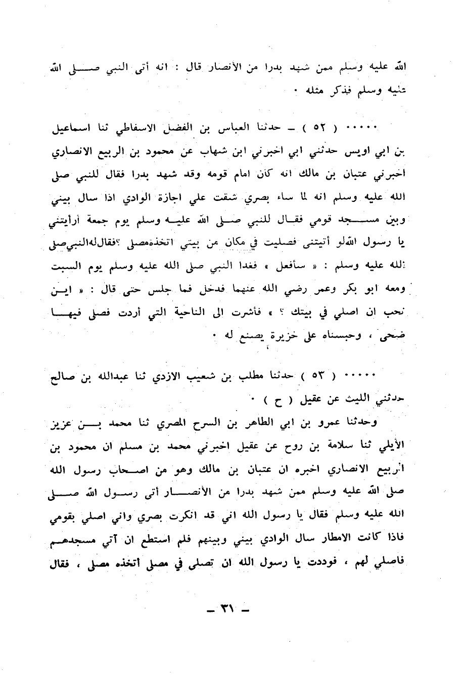52 - حَدَّثَنَا الْعَبَّاسُ بْنُ الْفَضْلِ الْأَسْفَاطِيُّ، ثنا إِسْمَاعِيلُ بْنُ أَبِي أُوَيْسٍ، حَدَّثَنِي أَبِي، أَخْبَرَنِي ابْنُ شِهَابٍ، عَنْ مَحْمُودِ بْنِ الرَّبِيعِ الْأَنْصَارِيِّ، أَخْبَرَنِي عِتْبَانُ بْنُ مَالِكٍ، أَنَّهُ كَانَ إِمَامَ قَوْمِهِ وَقَدْ شَهِدَ بَدْرًا فَقَالَ لِلنَّبِيِّ صَلَّى اللهُ عَلَيْهِ وَسَلَّمَ: أَنَّهُ لَمَّا سَاءَ بَصَرِي شَقَّتْ عَلِيَّ إِجَازَةُ الْوَادِي إِذَا سَالَ بَيْنِي وَبَيْنَ مَسْجِدِ قَوْمِي، فَقَالَ لِلنَّبِيِّ صَلَّى اللهُ عَلَيْهِ وَسَلَّمَ يَوْمَ جُمُعَةٍ: أَرَأَيْتَنِي يَا رَسُولَ اللهِ، لَوْ أَتَيْتَنِي فَصَلَّيْتَ فِي مَكَانٍ مِنْ بَيْتِي أَتَّخِذُهُ مُصَلًّى، فَقَالَ لَهُ النَّبِيُّ صَلَّى اللهُ عَلَيْهِ وَسَلَّمَ: «سَأَفْعَلُ» فَغَدَا النَّبِيُّ صَلَّى اللهُ عَلَيْهِ وَسَلَّمَ يَوْمَ السَّبْتِ وَمَعَهُ أَبُو بَكْرٍ وَعُمَرُ رَضِي اللهُ عَنْهُمَا، فَدَخَلَ فَمَا جَلَسَ حَتَّى قَالَ: «§أَيْنَ تُحِبُّ أَنْ أُصَلِّيَ فِي بَيْتِكَ؟» فَأَشَرْتُ إِلَى النَّاحِيَةِ الَّتِي أَرَدْتُ فَصَلَّى فِيهَا ضُحَى، وَحَبَسْنَاهُ عَلَى خَزِيرَةٍ يُصْنَعُ لَهُ