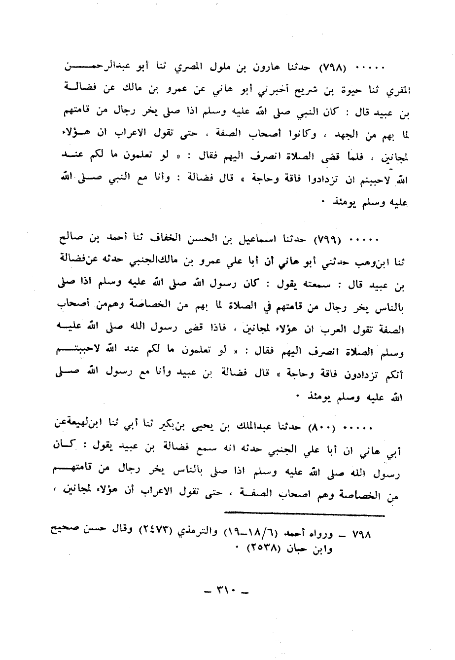 798 - حَدَّثَنَا هَارُونُ بْنُ مَلُولٍ الْمِصْرِيُّ، ثنا أَبُو عَبْدِ الرَّحْمَنِ الْمُقْرِئُ، ثنا حَيْوَةُ بْنُ شُرَيْحٍ، أَخْبَرَنِي أَبُو هَانِي، عَنْ عَمْرِو بْنِ مَالِكٍ، عَنْ فَضَالَةَ بْنِ عُبَيْدٍ قَالَ: كَانَ النَّبِيُّ صَلَّى اللهُ عَلَيْهِ وَسَلَّمَ إِذَا صَلَّى يَخِرُّ رِجَالٌ مِنْ قَامَتِهِمْ لِمَا بِهِمْ مِنَ الْجَهْدِ، وَكَانُوا أَصْحَابَ الصُّفَّةِ حَتَّى تَقُولَ الْأَعْرَابُ: إِنَّ هَؤُلَاءِ لَمَجَانِينَ، فَلَمَّا قَضَى الصَّلَاةَ انْصَرَفَ إِلَيْهِمْ فَقَالَ: «§لَوْ تَعْلَمُونَ مَا لَكُمْ عِنْدَ اللهِ لَأَحْبَبْتُمْ أَنْ تَزْدَادُوا فَاقَةً وَحَاجَةً» ، قَالَ فَضَالَةُ: «وَأَنَا مَعَ النَّبِيِّ صَلَّى اللهُ عَلَيْهِ وَسَلَّمَ يَوْمَئِذٍ»