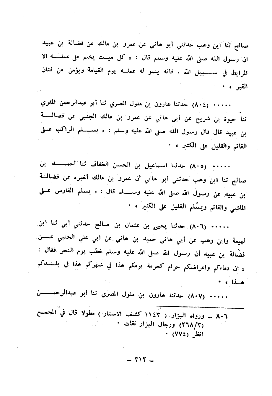 804 - حَدَّثَنَا هَارُونُ بْنُ مَلُولٍ الْمِصْرِيُّ، ثنا أَبُو عَبْدِ الرَّحْمَنِ الْمُقْرِئُ، ثنا حَيْوَةُ بْنُ شُرَيْحٍ، عَنْ أَبِي هَانِي، عَنْ عَمْرِو بْنِ مَالِكٍ الْجَنْبِيِّ، عَنْ فَضَالَةَ بْنِ عُبَيْدٍ قَالَ: قَالَ رَسُولُ اللهِ صَلَّى اللهُ عَلَيْهِ وَسَلَّمَ: «§يُسَلِّمُ الرَّاكِبُ عَلَى الْقَائِمِ، وَالْقَلِيلُ عَلَى الْكَثِيرِ»