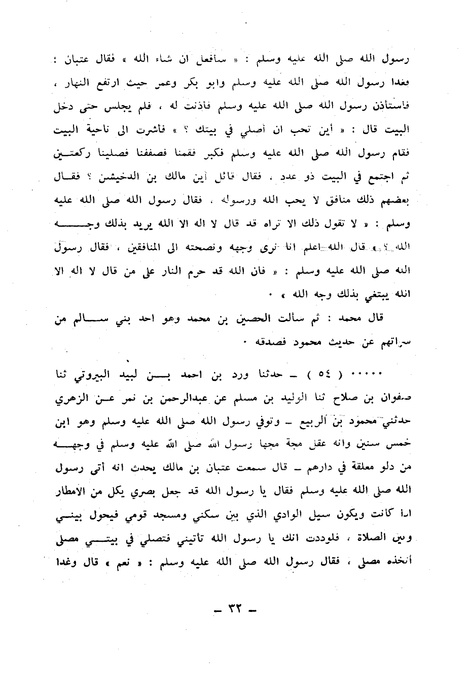 54 - حَدَّثَنَا وَرْدُ بْنُ أَحْمَدَ بْنِ لَبِيدٍ الْبَيْرُوتِيِّ، ثنا صَفْوَانُ بْنُ صَالِحٍ، ثنا الْوَلِيدُ بْنُ مُسْلِمٍ، عَنْ عَبْدِ الرَّحْمَنِ بْنِ نَمِرٍ، عَنِ الزُّهْرِيِّ، حَدَّثَنِي مَحْمُودُ بْنُ الرَّبِيعِ، «وَتُوُفِّيَ رَسُولُ اللهِ صَلَّى اللهُ عَلَيْهِ وَسَلَّمَ وَهُوَ ابْنُ خَمْسِ سِنِينَ وَإِنَّهُ §عَقَلَ مَجَّةً مَجَّهَا رَسُولُ اللهِ صَلَّى اللهُ عَلَيْهِ وَسَلَّمَ فِي وَجْهِهِ مِنْ دَلْوٍ مُعَلَّقَةٍ فِي دَرَاهِمْ»