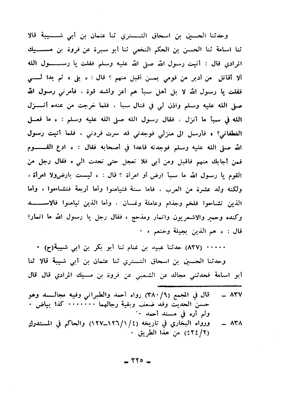 837 - حَدَّثَنَا عُبَيْدُ بْنُ غَنَّامٍ، ثَنَا أَبُو بَكْرِ بْنُ أَبِي شَيْبَةَ، ح وَحَدَّثَنَا الْحُسَيْنُ بْنُ إِسْحَاقَ التُّسْتَرِيُّ، ثَنَا عُثْمَانُ بْنُ أَبِي شَيْبَةَ، قَالَا: ثَنَا أَبُو أُسَامَةَ، فَحَدَّثَنِي مُجَالِدٌ، عَنِ الشَّعْبِيِّ، عَنْ فَرْوَةَ بْنِ مِسِّيكٍ الْمُرَادِيِّ، قَالَ: قَالَ لِي رَسُولُ اللهِ صَلَّى اللهُ عَلَيْهِ وَسَلَّمَ: «§أَكَرِهْتَ يَوْمِيكُمْ وَيَوْمَي هَمْدَانَ؟» قَالَ: نَعَمْ يَا رَسُولَ اللهِ فَنَاءُ الْأَهْلِ وَالْعَشِيرَةِ، فَقَالَ: «أَمَا أَنَّهُ خَيْرٌ لِمَنْ بَقِيَ مِنْكُمْ»