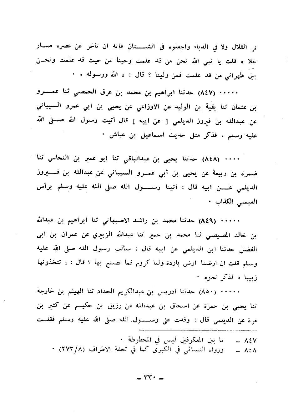 849 - حَدَّثَنَا مُحَمَّدُ بْنُ رَاشِدٍ الْأَصْبَهَانِيُّ، ثَنَا إِبْرَاهِيمُ بْنُ عَبْدِ اللهِ بْنِ خَالِدٍ الْمِصِّيصِيُّ، ثَنَا مُحَمَّدُ بْنُ حِمْيَرَ، ثَنَا عَبْدُ اللهِ الزُّبَيْرِيُّ، عَنْ عِمْرَانَ بْنِ أَبِي الْفَضْلِ، حَدَّثَنَا ابْنُ الدَّيْلَمِيِّ، عَنْ أَبِيهِ، قَالَ: سَأَلْتُ رَسُولَ اللهِ صَلَّى اللهُ عَلَيْهِ وَسَلَّمَ قُلْتُ: إِنَّ أَرْضَنَا أَرْضٌ بَارِدَةٌ وَلَنَا كُرُومٌ فَمَا نَصْنَعُ بِهَا؟ قَالَ: «§تَتَّخِذُونَهَا زَبِيبًا» فَذَكَرَ نَحْوَهُ