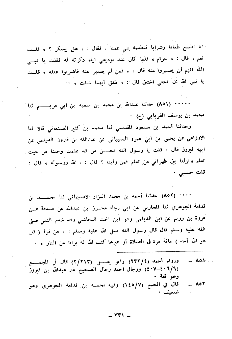 851 - حَدَّثَنَا عَبْدُ اللهِ بْنُ مُحَمَّدِ بْنِ سَعِيدِ بْنِ أَبِي مَرْيَمَ، ثَنَا مُحَمَّدُ بْنُ يُوسُفَ الْفِرْيَابِيُّ، ح وَحَدَّثَنَا أَحْمَدُ بْنُ مَسْعُودٍ الْمَقْدِسِيُّ، ثَنَا مُحَمَّدُ بْنُ كَثِيرٍ الصَّنْعَانِيُّ، قَالَا: ثَنَا الْأَوْزَاعِيُّ، عَنْ يَحْيَى بْنِ أَبِي عَمْرٍو السَّيْبَانِيِّ، عَنْ عَبْدِ اللهِ بْنِ فَيْرُوزَ الدَّيْلَمِيِّ، عَنْ أَبِيهِ فَيْرُوزَ قَالَ: قُلْتُ: يَا رَسُولَ اللهِ نَحْنُ مَنْ قَدْ عَلِمْتَ، وَحَيِّنَا مِنْ حَيْثُ تَعْلَمُ، وَنَزَلْنَا بَيْنَ ظَهْرَانَي مَنْ تَعْلَمُ، فَمَنْ وَلِيُّنَا؟ قَالَ: «§اللهُ وَرَسُولُهُ» قَالَ: قُلْتُ حَسْبِي