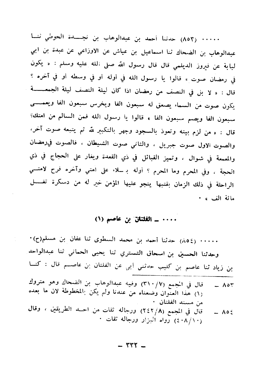 853 - حَدَّثَنَا أَحْمَدُ بْنُ عَبْدِ الْوَهَّابِ بْنِ نَجْدَةَ الْحَوْطِيُّ، ثَنَا عَبْدُ الْوَهَّابِ بْنُ الضَّحَّاكِ، ثَنَا إِسْمَاعِيلُ بْنُ عَيَّاشٍ، عَنِ الْأَوْزَاعِيِّ، عَنْ عَبْدَةَ بْنِ أَبِي لُبَابَةَ، عَنْ فَيْرُوزَ الدَّيْلَمِيِّ، قَالَ: قَالَ رَسُولُ اللهِ صَلَّى اللهُ عَلَيْهِ وَسَلَّمَ: «§يَكُونُ فِي رَمَضَانَ صَوْتٌ» قَالُوا: يَا رَسُولَ اللهِ فِي أَوَّلِهِ أَو فِي وَسَطِهِ أَو فِي آخِرِهِ؟ قَالَ: «لَا، بَلْ فِي النِّصْفِ مِنْ رَمَضَانَ، إِذَا كَانَ لَيْلَةُ النِّصْفِ لَيْلَةَ الْجُمُعَةِ يَكُونُ صَوْتٌ مِنَ السَّمَاءِ يُصْعَقُ لَهُ سَبْعُونَ أَلْفًا، وَيُخْرَسُ سَبْعُونَ أَلْفًا، وَيُعْمَى سَبْعُونَ أَلْفًا، وَيُصِمُّ سَبْعُونَ أَلْفًا» قَالُوا: يَا رَسُولَ اللهِ فَمَنِ السَّالِمُ مِنْ أُمَّتِكَ؟ قَالَ: «مَنْ لَزِمَ بَيْتَهُ، وَتَعَوَّذَ بِالسُّجُودِ، وَجَهَرَ بِالتَّكْبِيرِ لِلَّهِ، ثُمَّ يَتْبَعُهُ صَوْتٌ آخَرُ، وَالصَّوْتُ الْأَوَّلُ صَوْتُ جِبْرِيلَ، وَالثَّانِي صَوْتُ الشَّيْطَانِ، فَالصَّوْتُ فِي رَمَضَانَ، وَالمَعْمَعَةُ فِي شَوَّالٍ، وَتُمَيَّزُ الْقَبَائِلُ فِي ذِي الْقَعْدَةِ، وَيَغَارُ عَلَى الْحُجَّاجِ فِي ذِي الْحِجَّةِ وَفِي الْمُحْرِمِ، وَمَا الْمُحْرَّمُ؟ أَوَّلُهُ بَلَاءٌ عَلَى أُمَّتِي، وَآخِرُهُ فَرَحٌ لِأُمَّتِي، الرَّاحِلَةُ فِي ذَلِكَ الزَّمَانِ بِقَتَبِهَا يَنْجُو عَلَيْهَا الْمُؤْمِنُ لَهُ مِنْ دَسْكَرَةٍ تَغُلُّ مِائَةَ أَلْفٍ»