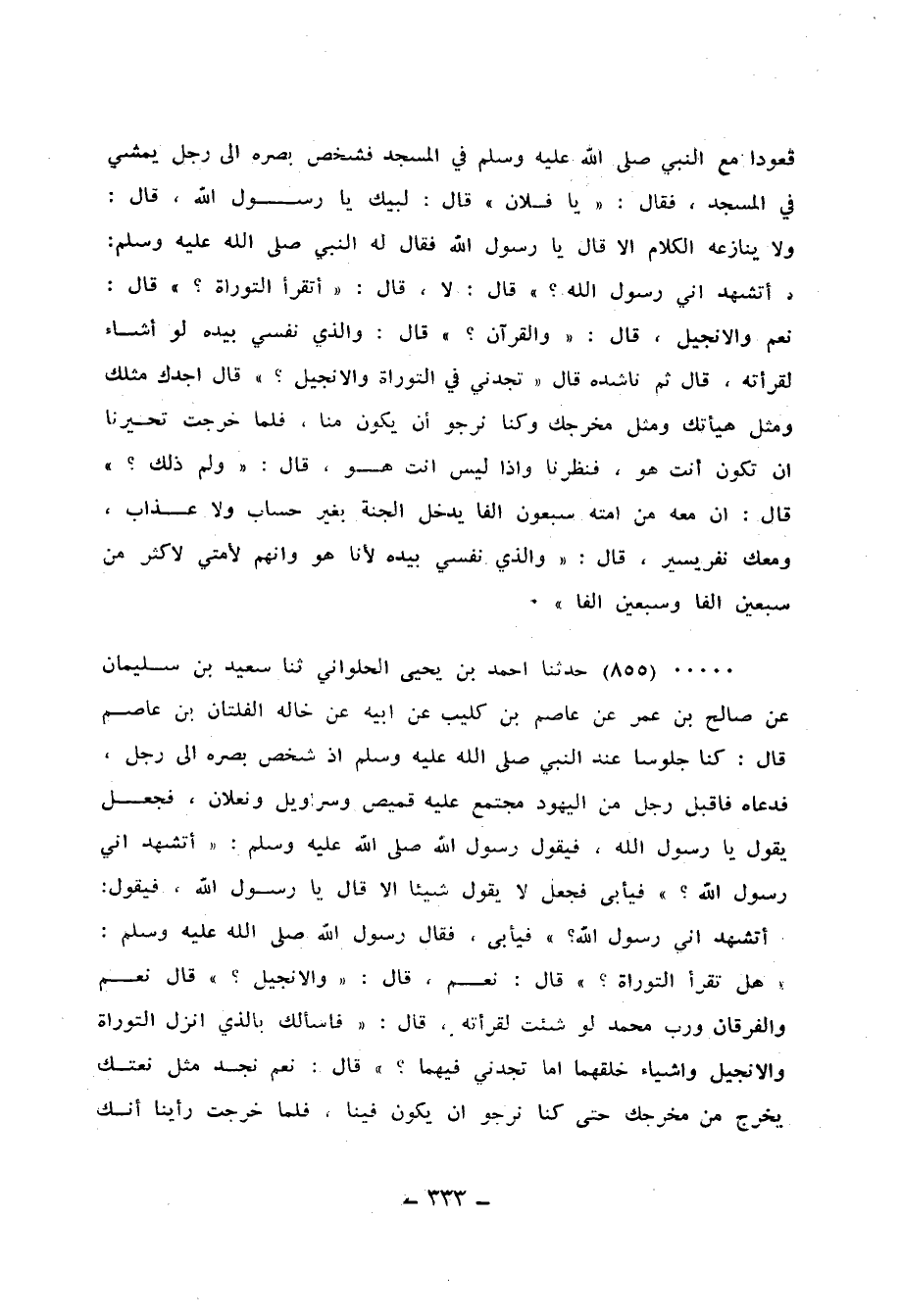 855 - حَدَّثَنَا أَحْمَدُ بْنُ يَحْيَى الْحُلْوَانِيُّ، ثَنَا سَعِيدُ بْنُ سُلَيْمَانَ، عَنْ صَالِحِ بْنِ عُمَرَ، عَنْ عَاصِمِ بْنِ كُلَيْبٍ، عَنْ أَبِيهِ، عَنْ خَالِهِ الفَلْتَانِ بْنِ عَاصِمٍ، قَالَ: كُنَّا جُلُوسًا عِنْدَ النَّبِيِّ صَلَّى اللهُ عَلَيْهِ وَسَلَّمَ إِذْ شَخَصَ بَصَرُهُ إِلَى رَجُلٍ فَدَعَاهُ فَأَقْبَلَ رَجُلٌ مِنَ الْيَهُودِ مُجْتَمِعٌ عَلَيْهِ قَمِيصٌ وَسَرَاوِيلُ وَنَعْلَانِ، فَجَعَلَ يَقُولُ: يَا رَسُولَ اللهِ، فَيَقُولُ رَسُولُ اللهِ صَلَّى اللهُ عَلَيْهِ وَسَلَّمَ: «أَتَشْهَدُ أَنِّي رَسُولُ اللهِ؟» فَيَأْبَى، فَجَعَلَ لَا يَقُولُ شَيْئًا إِلَّا قَالَ: يَا رَسُولَ اللهِ فَيَقُولُ: «أَتَشْهَدُ أَنِّي رَسُولُ اللهِ؟» فَيَأْبَى، فَقَالَ رَسُولُ اللهِ صَلَّى اللهُ عَلَيْهِ وَسَلَّمَ: «هَلْ تَقْرَأُ التَّوْرَاةَ؟» قَالَ: نَعَمْ، قَالَ: «وَالْإِنْجِيلَ؟» قَالَ: نَعَمْ، وَالْفُرْقَانَ وَرَبِّ مُحَمَّدٍ لَو شِئْتَ لَقَرَأْتُهُ، قَالَ: «فَأَسْأَلُكَ بِالَّذِي أَنْزَلَ التَّوْرَاةَ وَالْإِنْجِيلَ وَأَشْيَاءَ خَلَقَهُمَا أَمَا تَجِدُنِي فِيهِمَا؟» قَالَ: نَعَمْ نَجِدُ مِثْلَ نَعْتِكَ يَخْرُجُ مِنْ مَخْرَجِكَ حَتَّى كُنَّا نَرْجُو أَنْ يَكُونَ فِينَا، فَلَمَّا خَرَجْتَ رَأَيْنَا أَنَّكَ أَنْتَ هُوَ، فَلَمَّا نَظَرْنَا إِذَا أَنْتَ لَيْسَ بِهِ، قَالَ: «مِنْ أَيْنَ؟» قَالَ: نَجِدُ مِنْ أُمَّتِهِ سَبْعِينَ أَلْفًا يَدْخُلُونَ الْجَنَّةَ بِغَيْرِ حِسَابٍ، وَإِنَّمَا أَنْتُمْ قَلِيلٌ، فَأَقْبَلَ رَسُولُ اللهِ صَلَّى اللهُ عَلَيْهِ وَسَلَّمَ وَكَبَّرَ وَهَلَّلَ مَرَّتَيْنِ ثُمَّ قَالَ: «وَالَّذِي نَفْسِي بِيَدِهِ §إِنِّي لَأَنَا هُوَ، وَإِنَّ أُمَّتِي لَأَكْثَرَ مِنْ سَبْعِينَ أَلْفًا وَسَبْعِينَ أَلْفًا»