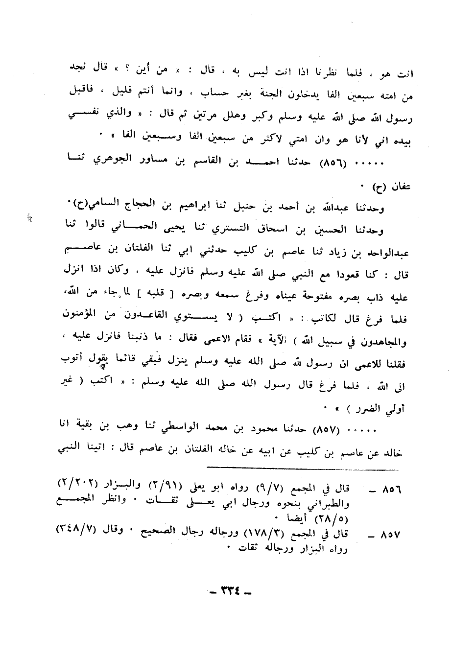 856 - حَدَّثَنَا أَحْمَدُ بْنُ الْقَاسِمِ بْنِ مُسَاوِرٍ الْجَوْهَرِيُّ، ثَنَا عَفَّانُ، ح وَحَدَّثَنَا عَبْدُ اللهِ بْنُ أَحْمَدَ بْنِ حَنْبَلٍ، ثَنَا إِبْرَاهِيمُ بْنُ الْحَجَّاجِ السَّامِيُّ، ح وَحَدَّثَنَا الْحُسَيْنُ بْنُ إِسْحَاقَ التُّسْتَرِيُّ، ثَنَا يَحْيَى الْحِمَّانِيُّ قَالُوا: ثَنَا عَبْدُ الْوَاحِدِ بْنُ زِيَادٍ، ثَنَا عَاصِمُ بْنُ كُلَيْبٍ، حَدَّثَنِي أَبِي، ثَنَا الفَلْتَانُ بْنُ عَاصِمٍ، قَالَ: كُنَّا قُعُودًا مَعَ النَّبِيِّ صَلَّى اللهُ عَلَيْهِ وَسَلَّمَ فَأُنْزِلَ عَلَيْهِ وَكَانَ إِذَا أُنْزِلَ عَلَيْهِ ذَابَ بَصَرُهُ، مَفْتُوحَةٌ عَيْنَاهُ، وَفَرَّغَ سَمْعَهُ وَبَصَرَهُ قَلْبَهُ لِمَا جَاءَ مِنَ اللهِ فَلَمَّا فَرَغَ قَالَ لِكَاتِبٍ: " اكْتُبْ: {§لَا يَسْتَوِي الْقَاعِدُونَ مِنَ الْمُؤْمِنِينَ وَالْمُجَاهِدُونَ فِي سَبِيلِ اللهِ} الْآيَةَ "، فَقَامَ الْأَعْمَى، فَقَالَ: مَا ذَنْبُنَا؟ فَأُنْزِلَ عَلَيْهِ، فَقُلْنَا لِلْأَعْمَى: إِنَّ رَسُولَ اللهِ صَلَّى اللهُ عَلَيْهِ وَسَلَّمَ يَنْزِلُ، فَبَقِيَ قَائِمًا يَقُولُ: أَتُوبُ إِلَى اللهِ، فَلَمَّا فَرَغَ قَالَ رَسُولُ اللهِ صَلَّى اللهُ عَلَيْهِ وَسَلَّمَ: " اكْتُبْ {غَيْرُ أُولِي الضَّرَرِ} [النساء: 95] "