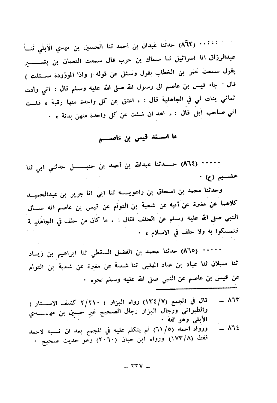 864 - حَدَّثَنَا عَبْدُ اللهِ بْنُ أَحْمَدَ بْنِ حَنْبَلٍ، حَدَّثَنِي أَبِي، ثَنَا هُشَيْمٌ، ح وَحَدَّثَنَا مُحَمَّدُ بْنُ إِسْحَاقَ بْنِ رَاهَوَيْهِ، ثَنَا أَبِي، أَنَا جَرِيرُ بْنُ عَبْدِ الْحَمِيدِ كِلَاهُمَا عَنْ مُغِيرَةَ، عَنْ أَبِيهِ، عَنْ شُعْبَةَ بْنِ التَّوْأَمِ، عَنْ قَيْسِ بْنِ عَاصِمٍ، أَنَّهُ سَأَلَ النَّبِيَّ صَلَّى اللهُ عَلَيْهِ وَسَلَّمَ عَنِ الْحِلْفِ، فَقَالَ: «§مَا كَانَ مِنْ حِلْفٍ فِي الْجَاهِلِيَّةِ فَتَمَسَّكُوا بِهِ، وَلَا حِلْفَ فِي الْإِسْلَامِ»