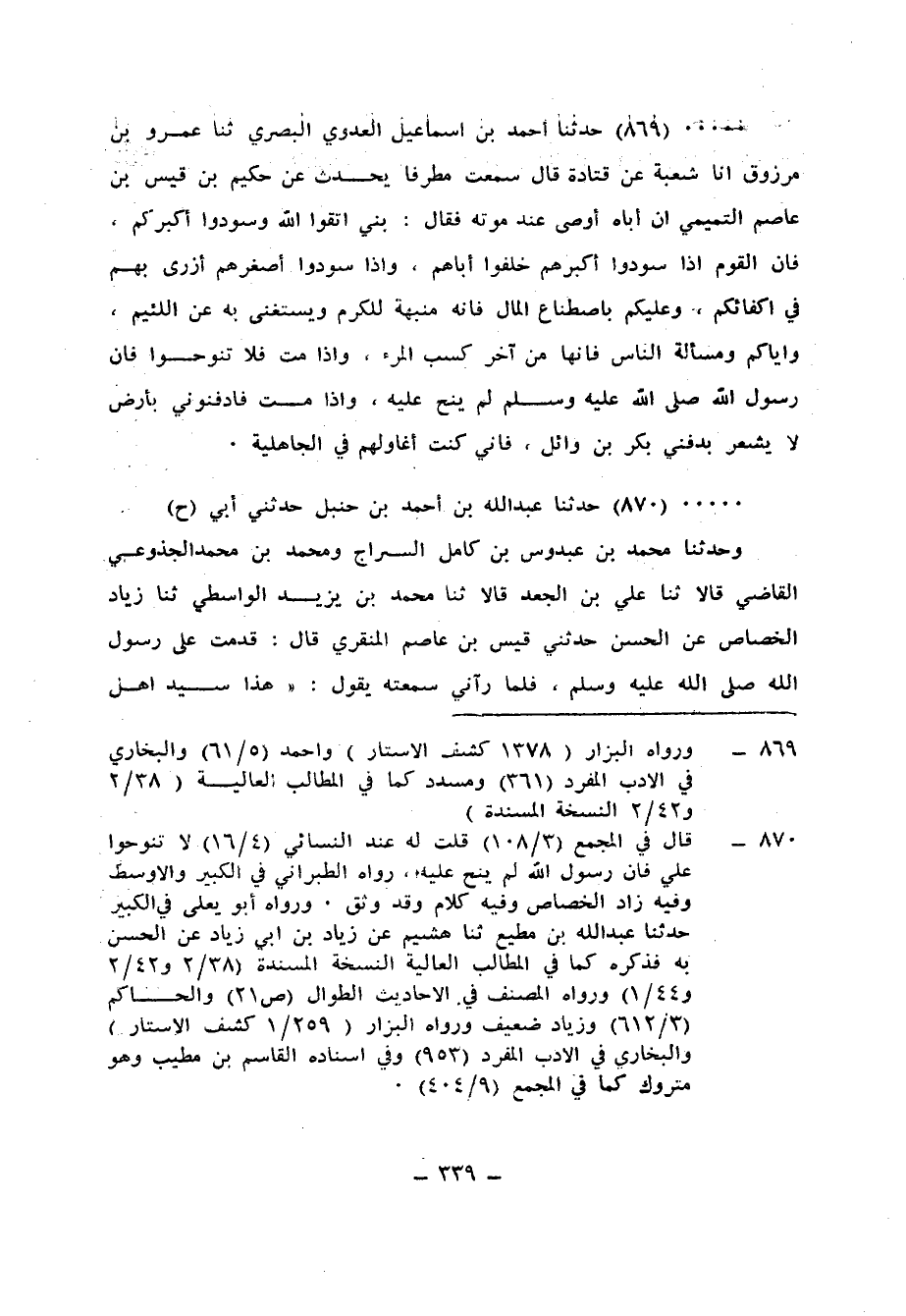 869 - حَدَّثَنَا أَحْمَدُ بْنُ إِسْمَاعِيلَ الْعَدَوِيُّ الْبَصْرِيُّ، ثَنَا عَمْرُو بْنُ مَرْزُوقٍ، أَنَا شُعْبَةُ، عَنْ قَتَادَةَ، قَالَ: سَمِعْتُ مُطَرِّفًا، يُحَدِّثُ عَنْ حَكِيمِ بْنِ قَيْسِ بْنِ عَاصِمٍ التَّمِيمِيِّ، أَنَّ أَبَاهُ، أَوْصَى عِنْدَ مَوْتِهِ فَقَالَ: «بَنِيَّ اتَّقُوا اللهَ، وَسَوِّدُوا أَكْبَرَكُمْ فَإِنَّ الْقَوْمَ إِذَا سَوَّدُوا أَكْبَرَهُمْ خُلِّفُوا أَبَاهُمْ، وَإِذَا سَوَّدُوا أَصْغَرَهُمْ أَزْرِي بِهِم فِي أَكِفَّائِكُمْ، وَعَلَيْكُمْ بِاصْطِنَاعِ الْمَالِ فَإِنَّهُ مَنْبَهَةٌ لِلْكَرَمِ، وَيُسْتَغْنَى بِهِ عَنِ اللَّئِيمِ، وَإِيَّاكُمْ وَمَسْأَلَةَ النَّاسِ فَإِنَّهَا مِنْ آخِرِ كَسْبِ الْمَرْءِ، وَإِذَا مُتُّ فَلَا تَنُوحُوا §فَإِنَّ رَسُولَ اللهِ صَلَّى اللهُ عَلَيْهِ وَسَلَّمَ لَمْ يُنَحْ عَلَيْهِ، وَإِذَا مُتُّ فَادْفِنُونِي بِأَرْضٍ لَا يَشْعُرُ بِدَفْنِي بَكْرُ بْنُ وَائِلٍ فَإِنِّي كُنْتُ أُغَاوِلُهُمْ فِي الْجَاهِلِيَّةِ»