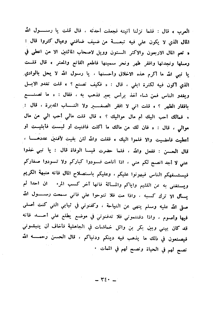 قَالَ : فَمَالُكَ أَحَبُّ إِلَيْكَ أَمْ مَالُ مَوَالِيكَ ؟ قَالَ : قُلْتُ : مَالِي أَحَبُّ إِلَيَّ مِنْ مَالِ مَوَالِيَّ ، قَالَ : فَإِنَّ لَكَ مِنْ مَالِكَ مَا أَكَلْتَ فَأَفْنَيْتَ ، أَو لَبِسْتَ فَأَبْلَيْتَ ، أَو أَعْطَيْتَ فَأَمْضَيْتَ ، وَإِلاَّ فَلُمُّوا إِلَيْكَ فَقُلْتُ : وَاللَّهِ لَئِنْ بَقِيَتُ لأَفْنِيَنَّ عَدَدَهَا ، قَالَ الْحَسَنُ : فَفَعَلَ وَاللَّهِ ، فَلَمَّا حَضَرَتْ قَيْسًا الْوَفَاةُ قَالَ : يَا بَنِيَّ خُذُوا عَنِّي ، لاَ أَجِدُ أَنْصَحَ لَكُمْ مِنِّي : إِذَا أَنَا مُتُّ فَسَوِّدُوا كِبَارَكُمْ ، وَلاَ تُسَوِّدُوا صِغَارَكُمْ فَيَسْتَسْفِهَكُمُ النَّاسُ فَيَهُونُوا عَلَيْكُمْ ، وَعَلَيْكُمْ بِاسْتِصْلاَحِ الْمَالِ ، فَإِنَّهُ مَنْبَهَةُ الْكَرِيمِ وَيُسْتَغْنَى بِهِ عَنِ اللَّئِيمِ ، وَإِيَّاكُمْ وَالْمَسْأَلَةَ فَإِنَّهَا آخِرُ كَسْبِ الْمَرْءِ ، إِنَّ أَحَدًا لَمْ يَسْأَلْ إِلاَّ تَرَكَ كَسْبَهُ ، وَإِذَا مُتُّ فَلاَ تَنُوحُوا عَلَيَّ فَإِنِّي سَمِعْتُ رَسُولَ اللهِ صَلَّى اللَّهُ عَلَيْهِ وَسَلَّمَ يَنْهَى عَنِ النِّيَاحَةِ وَكَفِّنُونِي فِي ثِيَابِي الَّتِي كُنْتُ أُصَلِّي فِيهَا وَأَصُومُ ، وَإِذَا دَفَنْتُمُونِي فَلاَ تَدْفِنُونِي فِي مَوْضِعٍ يَطَّلِعُ عَلَيَّ أَحَدٌ ، فَإِنَّهٌ قَدْ كَانَ بَيْنِي وَبَيْنَ بَكْرِ بْنِ وَائِلٍ خَمَاشَاتٌ فِي الْجَاهِلِيَّةِ فَأَخَافُ أَنْ يَنْبُشُونِي فَيَصْنَعُونَ فِي ذَلِكَ مَا يَذْهَبُ فِيهِ دِينُكُمْ وَدُنْيَاكُمْ قَالَ الْحَسَنُ رَحِمَهُ اللَّهُ : نَصَحَ لَهُمْ فِي الْحَيَاةِ ، وَنَصَحَ لَهُمْ فِي الْمَمَاتِ