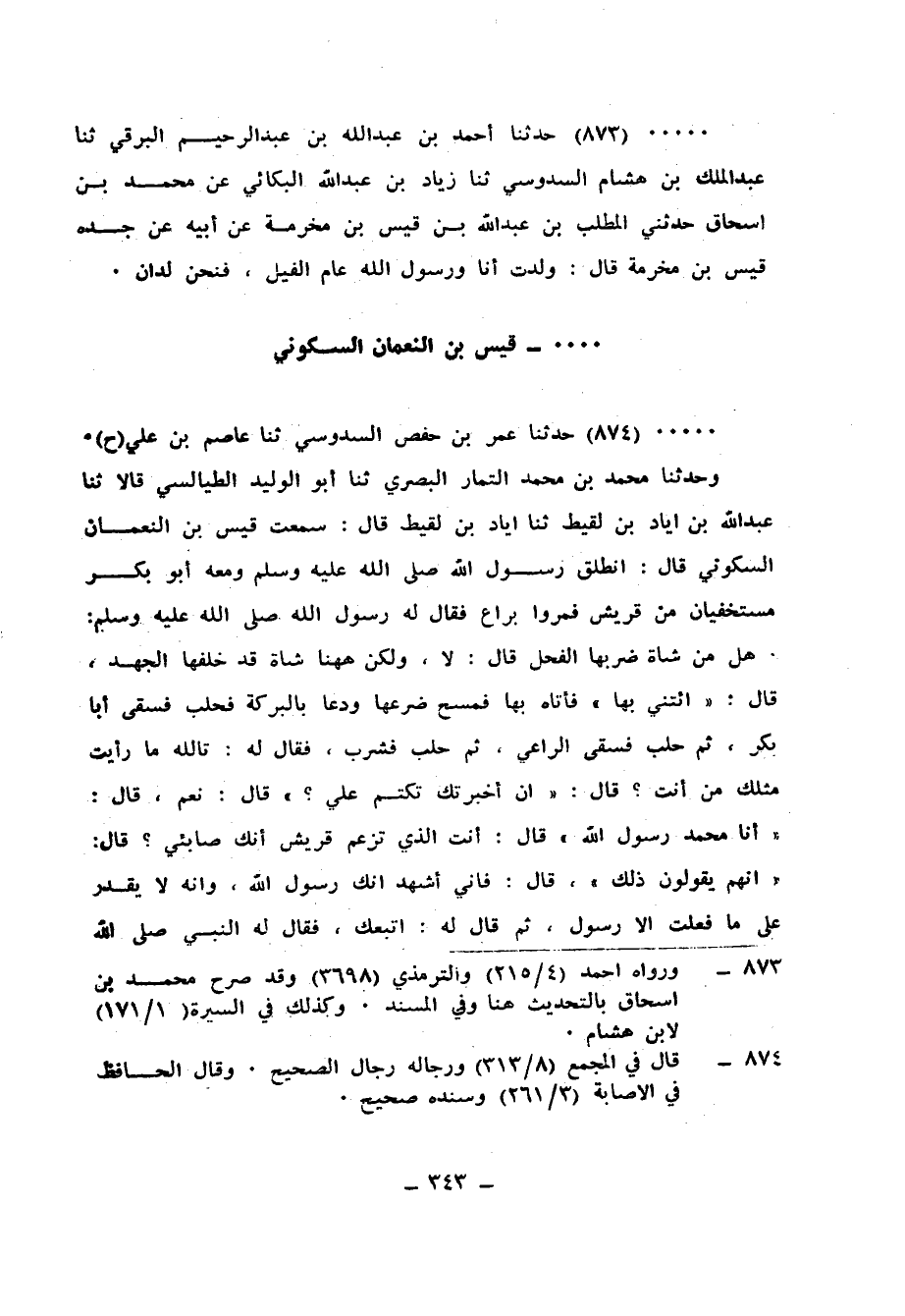 874 - حَدَّثَنَا عُمَرُ بْنُ حَفْصٍ السَّدُوسِيُّ، ثَنَا عَاصِمُ بْنُ عَلِيٍّ، ح وَحَدَّثَنَا مُحَمَّدُ بْنُ مُحَمَّدٍ التَّمَّارُ الْبَصْرِيُّ، ثَنَا أَبُو الْوَلِيدِ الطَّيَالِسِيُّ، قَالَا: ثَنَا عَبْدُ اللهِ بْنُ إِيَادِ بْنِ لَقِيطٍ، ثَنَا إِيَادُ بْنُ لَقِيطٍ، قَالَ: سَمِعْتُ قَيْسَ بْنَ النُّعْمَانِ السَّكُونِيَّ، قَالَ: انْطَلَقَ رَسُولُ اللهِ صَلَّى اللهُ عَلَيْهِ وَسَلَّمَ وَمَعَهُ أَبُو بَكْرٍ مُسْتَخْفِيَانِ مِنْ قُرَيْشٍ فَمَرُّوا بِرَاعٍ فَقَالَ لَهُ رَسُولُ اللهِ صَلَّى اللهُ عَلَيْهِ وَسَلَّمَ: «§هَلْ مِنْ شَاةٍ ضَرَبَهَا الْفَحْلُ؟» قَالَ: لَا، وَلَكِنْ هَهُنَا شَاةٌ قَدْ خَلَّفَهَا الْجَهْدُ، قَالَ: «ائْتِنِي بِهَا» فَأَتَاهُ بِهَا فَمَسَحَ ضَرْعَهَا وَدَعَا بِالْبَرَكَةِ، فَحَلَبَ فَسَقَى أَبَا بَكْرٍ ثُمَّ حَلَبَ فَسَقَى الرَّاعِي ثُمَّ حَلَبَ فَشَرِبَ، فَقَالَ لَهُ: تَالَلَّهِ مَا رَأَيْتُ مِثْلَكَ، مَنْ أَنْتَ؟ قَالَ: «إِنْ أَخْبَرْتُكَ تَكْتُمُ عَلَيَّ؟» قَالَ: نَعَمْ قَالَ: أَنَا مُحَمَّدٌ رَسُولُ اللهِ، قَالَ: أَنْتَ الَّذِي تَزْعُمُ قُرَيْشُ أَنَّكَ صَابِئِيٌّ؟ قَالَ: أَنَّهُمْ يَقُولُونَ ذَلِكَ، قَالَ: فَإِنِّي أَشْهَدُ أَنَّكَ رَسُولُ اللهِ وَإِنَّهُ لَا يَقْدِرُ عَلَى مَا فَعَلْتَ إِلَّا رَسُولٌ، ثُمَّ قَالَ لَهُ: أَتَّبِعُكَ؟ فَقَالَ لَهُ النَّبِيُّ صَلَّى اللهُ عَلَيْهِ وَسَلَّمَ: «أَمَّا الْيَوْمَ فَلَا، وَلَكِنْ إِذَا سَمِعْتَ أَنَّا قَدْ ظَهَرْنَا فَائْتِنَا» فَأَتَى النَّبِيَّ صَلَّى اللهُ عَلَيْهِ وَسَلَّمَ بَعْدَ مَا ظَهَرَ بِالْمَدِينَةِ