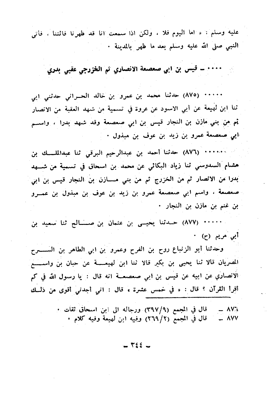 877 - حَدَّثَنَا يَحْيَى بْنُ عُثْمَانَ بْنِ صَالِحٍ، ثَنَا سَعِيدُ بْنُ أَبِي مَرْيَمَ، ح وَحَدَّثَنَا أَبُو الزِّنْبَاعِ رَوْحُ بْنُ الْفَرَجِ، وَعَمْرُو بْنُ أَبِي الطَّاهِرِ بْنِ السَّرْحِ الْمِصْرِيَّانِ قَالَا: ثَنَا يَحْيَى بْنُ بُكَيْرٍ قَالَا: ثَنَا ابْنُ لَهِيعَةَ، عَنْ حَبَّانَ بْنِ وَاسِعٍ الْأَنْصَارِيِّ، عَنْ أَبِيهِ، عَنْ قَيْسِ بْنِ أَبِي صَعْصَعَةَ، أنَّهُ قَالَ: يَا رَسُولَ اللهِ §فِي كَمْ أَقْرَأُ الْقُرْآنَ؟ قَالَ: «فِي خَمْسِ عَشْرَةَ» قَالَ: إِنِّي أَجِدُنِي أَقْوَى مِنْ ذَلِكَ، قَالَ: «فِي جُمُعَةٍ» قَالَ: إِنِّي أَجِدُنِي أَقْوَى مِنْ ذَلِكَ قَالَ: فَمَكَثَ كَذَلِكَ يَقْرَؤُهُ زَمَانًا حَتَّى كَبِرَ وَكَانَ يَعْصِبُ عَلَى عَيْنَيْهِ ثُمَّ رَجَعَ فَكَانَ يَقْرَؤُهُ فِي خَمْسِ عَشْرَةَ، قَالَ: يَا لَيْتَنِي قَبِلْتُ رُخْصَةَ رَسُولِ اللهِ صَلَّى اللهُ عَلَيْهِ وَسَلَّمَ الْأُولَى