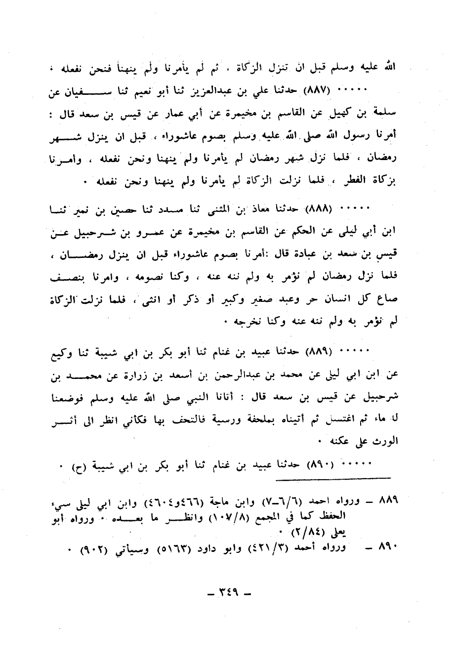 888 - حَدَّثَنَا مُعَاذُ بْنُ الْمُثَنَّى، ثَنَا مُسَدَّدٌ، ثَنَا حُصَيْنُ بْنُ نَمِرٍ، ثَنَا ابْنُ أَبِي لَيْلَى، عَنِ الْحَكَمِ، عَنِ الْقَاسِمِ بْنِ مُخَيْمِرَةَ، عَنْ عَمْرِو بْنِ شُرَحْبِيلَ، عَنْ قَيْسِ بْنِ سَعْدِ بْنِ عُبَادَةَ، قَالَ: §أُمِرْنَا بِصَوْمِ عَاشُورَاءَ قَبْلَ أَنْ يَنْزِلَ رَمَضَانُ فَلَمَّا نَزَلَ رَمَضَانُ لَمْ نُؤْمَرْ بِهِ، وَلَمْ نُنْهَ عَنْهُ وَكُنَّا نَصُومُهُ، وَأُمِرْنَا بِنِصْفِ صَاعٍ كُلُّ إِنْسَانٍ حُرٍّ وَعَبْدٍ صَغِيرٍ وَكَبِيرٍ، أَو ذَكَرٍ أَو أُنْثَى، فَلَمَّا نَزَلَتِ الزَّكَاةُ لَمْ نُؤْمَرْ بِهِ وَلَمْ نُنْهَ عَنْهُ، وَكُنَّا نُخْرِجُهُ