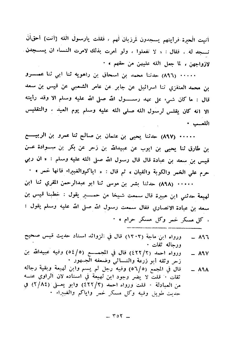 898 - حَدَّثَنَا بِشْرُ بْنُ مُوسَى، ثَنَا أَبُو عَبْدِ الرَّحْمَنِ الْمُقْرِيُّ، ثَنَا ابْنُ لَهِيعَةَ، حَدَّثَنِي ابْنُ هُبَيْرَةَ، قَالَ: سَمِعْتُ شَيْخًا، مِنَ حِمْيَرَ يَقُولُ: خَطَبَنَا قَيْسُ بْنُ سَعْدِ بْنِ عُبَادَةَ الْأَنْصَارِيُّ فَقَالَ: سَمِعْتُ رَسُولَ اللهِ صَلَّى اللهُ عَلَيْهِ وَسَلَّمَ يَقُولُ: «§كُلُّ مُسْكِرٍ خَمْرٌ، وَكُلُّ مُسْكِرٍ حَرَامٌ»