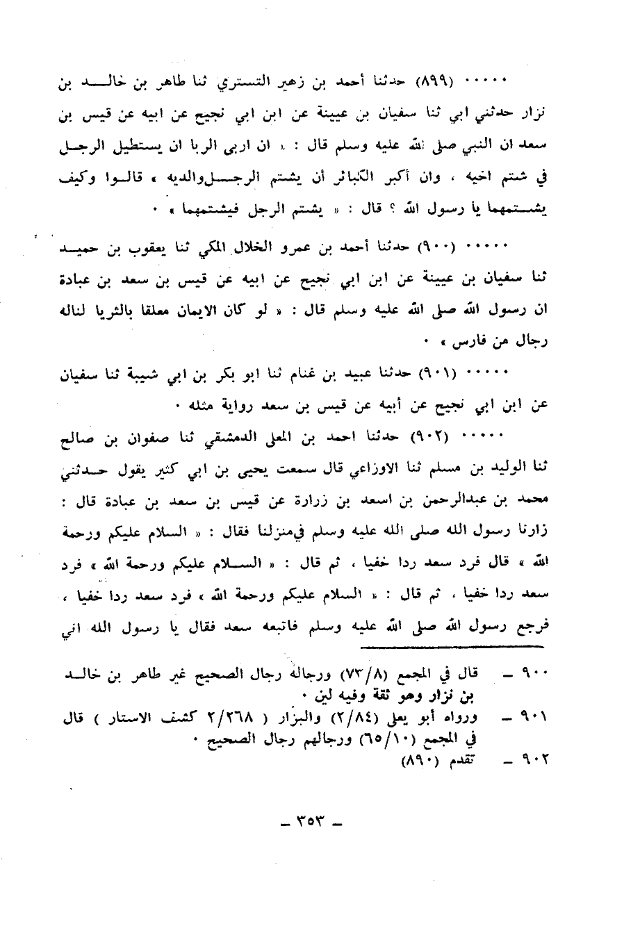 899 - حَدَّثَنَا أَحْمَدُ بْنُ زُهَيْرٍ التُّسْتَرِيُّ، ثَنَا طَاهِرُ بْنُ خَالِدِ بْنِ نِزَارٍ، حَدَّثَنِي أَبِي، ثَنَا سُفْيَانُ بْنُ عُيَيْنَةَ، عَنِ ابْنِ أَبِي نَجِيحٍ، عَنْ أَبِيهِ، عَنْ قَيْسِ بْنِ سَعْدٍ، أَنَّ النَّبِيَّ صَلَّى اللهُ عَلَيْهِ وَسَلَّمَ قَالَ: " إِنَّ §أَرْبَى الرِّبَا أَنْ يَسْتَطِيلَ الرَّجُلُ فِي شَتَمِ أَخِيهِ، وَإِنَّ أَكْبَرَ الْكَبَائِرِ أَنْ يَشْتِمَ الرَّجُلُ وَالِدَيْهِ، قَالُوا: وَكَيْفَ يَشْتِمُهُمَا يَا رَسُولَ اللهِ؟ قَالَ: يَشْتِمُ الرَّجُلَ، فَيَشْتِمُهُمَا "