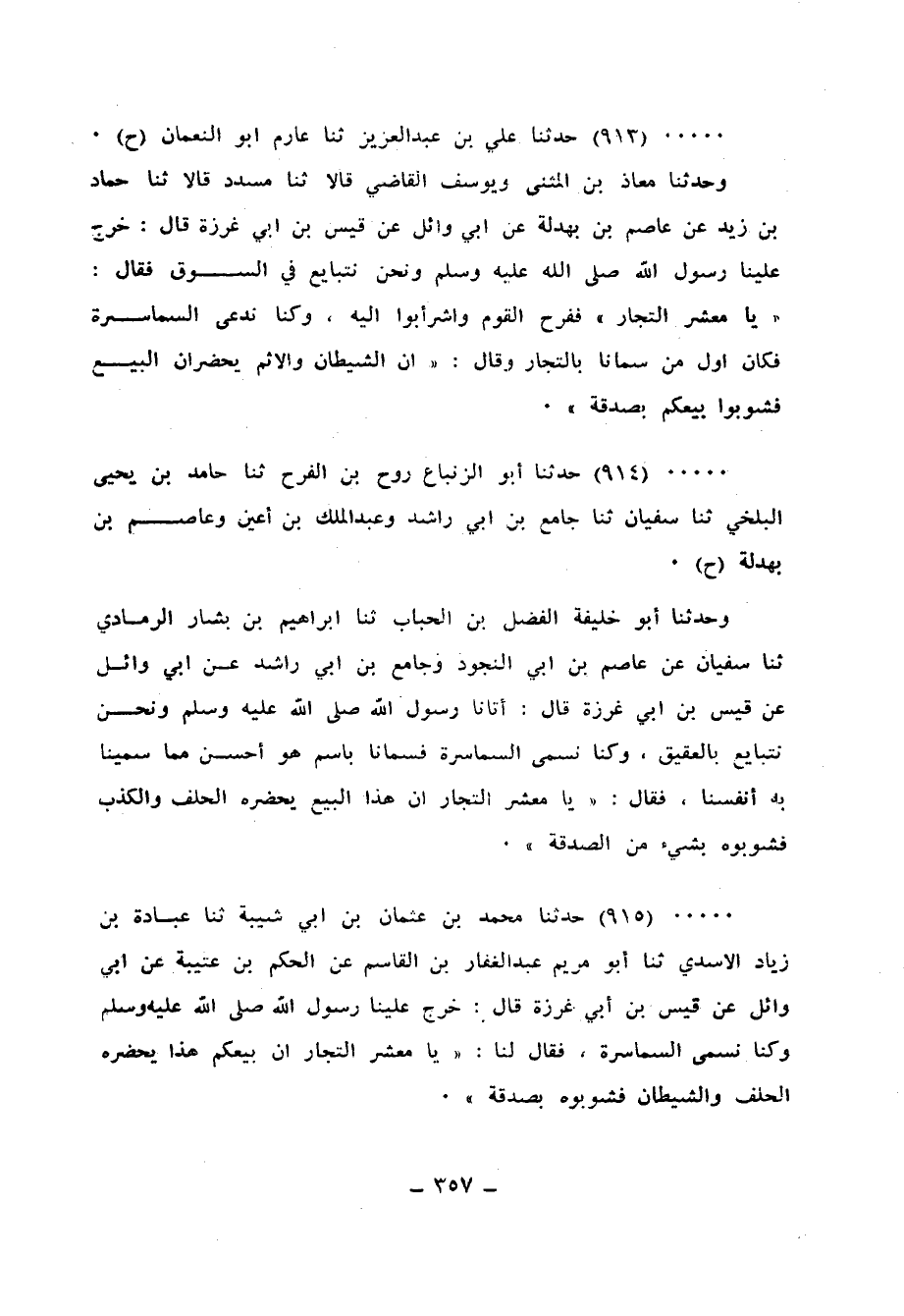 913 - حَدَّثَنَا عَلِيُّ بْنُ عَبْدِ الْعَزِيزِ، ثَنَا عَارِمُ أَبُو النُّعْمَانِ، ح وَحَدَّثَنَا مُعَاذُ بْنُ الْمُثَنَّى، وَيُوسُفُ الْقَاضِي، قَالَا: ثَنَا مُسَدَّدٌ، قَالَا: ثَنَا حَمَّادُ بْنُ زَيْدٍ، عَنْ عَاصِمِ ابْنِ بَهْدَلَةَ، عَنْ أَبِي وَائِلٍ، عَنْ قَيْسِ بْنِ أَبِي غَرَزَةَ، قَالَ: خَرَجَ عَلَيْنَا رَسُولُ اللهِ صَلَّى اللهُ عَلَيْهِ وَسَلَّمَ وَنَحْنُ نَتَبَايَعُ فِي السُّوقِ فَقَالَ: «يَا مَعْشَرَ التُّجَّارِ» فَفَرِحَ الْقَوْمُ وَاشْرَأَبُّوا إِلَيْهِ، وَكُنَّا نُدْعَى السَّمَاسِرَةَ فَكَانَ أَوَّلَ مَنْ سَمَّانَا بِالتُّجَّارِ، وَقَالَ: «إِنَّ §الشَّيْطَانَ وَالإِثْمَ يَحْضُرَانِ الْبَيْعَ، فَشُوبُوا بَيْعَكُمْ بِصَدَقَةٍ»