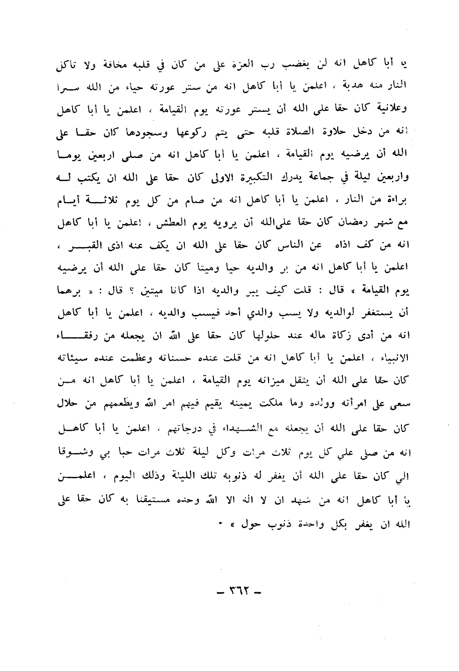 يَا أَبَا كَاهِلٍ أَنَّهُ لَنْ يَغْضَبَ رَبُّ الْعِزَّةِ عَلَى مَنْ كَانَ فِي قَلْبِهِ مَخَافَةٌ، وَلَا تَأْكُلُ النَّارُ مِنْهُ هُدْبَةً، اعْلَمَنَّ يَا أَبَا كَاهِلٍ أَنَّهُ مَنْ سَتَرَ عَوْرَتَهُ حَيَاءً مِنَ اللهِ سِرًّا وَعَلَانِيَةً كَانَ حَقًّا عَلَى اللهِ أَنْ يَسْتُرَ عَوْرَتَهُ يَوْمَ الْقِيَامَةِ، اعْلَمَنَّ يَا أَبَا كَاهِلٍ أَنَّهُ مَنْ دَخَلَ حَلَاوَةُ الصَّلَاةِ قَلْبَهُ حَتَّى يُتِمَّ رُكُوعَهَا وَسُجُودَهَا كَانَ حَقًّا عَلَى اللهِ أَنْ يُرْضِيَهُ يَوْمَ الْقِيَامَةِ، اعْلَمَنَّ يَا أَبَا كَاهِلٍ أَنَّهُ مَنْ صَلَّى أَرْبَعِينَ يَوْمًا وَأَرْبَعِينَ لَيْلَةً فِي جَمَاعَةٍ يُدْرِكُ التَّكْبِيرَةَ الْأُولَى كَانَ حَقًّا عَلَى اللهِ أَنْ يَكْتُبَ لَهُ بَرَاءَةً مِنَ النَّارِ، اعْلَمَنَّ يَا أَبَا كَاهِلٍ أَنَّهُ مَنْ صَامَ مِنْ كُلِّ شَهْرٍ ثَلَاثَةَ أَيَّامٍ مَعَ شَهْرِ رَمَضَانَ كَانَ حَقًّا عَلَى اللهِ أَنْ يَرْوِيَهُ يَوْمَ الْعَطَشِ، اعْلَمَنَّ يَا أَبَا كَاهِلٍ أَنَّهُ مَنْ كَفَّ أَذَاهُ عَنِ النَّاسِ كَانَ حَقًّا عَلَى اللهِ أَنْ يَكُفَّ عَنْهُ أَذَى الْقَبْرِ، اعْلَمَنَّ يَا أَبَا كَاهِلٍ أَنَّهُ مَنْ بَرَّ وَالِدَيْهِ حَيًّا وَمَيِّتًا كَانَ حَقًّا عَلَى اللهِ أَنْ يُرْضِيَهُ يَوْمَ الْقِيَامَةِ» قَالَ: قُلْتُ: كَيْفَ يَبَرُّ وَالِدَيْهِ إِذَا كَانَا مَيِّتَيْنِ؟ قَالَ: «بِرُّهُمَا أَنْ يَسْتَغْفِرَ لِوَالِدَيْهِ، وَلَا يَسُبَّ وَالِدِي أَحَدٍ فَيَسُبَّ وَالِدَيْهِ، اعْلَمَنَّ يَا أَبَا كَاهِلٍ أَنَّهُ مَنْ أَدَّى زَكَاةَ مَالِهِ عِنْدَ حُلُولِهَا كَانَ حَقًّا عَلَى اللهِ أَنْ يَجْعَلَهُ مِنْ رُفَقَاءِ الْأَنْبِيَاءِ، اعْلَمَنَّ يَا أَبَا كَاهِلٍ أَنَّهُ مَنْ قَلَّتْ عِنْدَهُ حَسَنَاتُهُ وَعَظُمَتْ عِنْدَهُ سَيِّئَاتُهُ كَانَ حَقًّا عَلَى اللهِ أَنْ يُثَقِّلَ مِيزَانَهُ يَوْمَ الْقِيَامَةِ، اعْلَمَنَّ يَا أَبَا كَاهِلٍ أَنَّهُ مَنْ سَعَى عَلَى امْرَأَتِهِ وَوَلَدِهِ وَمَا مَلَكَتْ يَمِينُهُ يُقِيمُ فِيهِمْ أَمَرَ اللهِ، وَيُطْعِمُهُمْ مِنْ حَلَالٍ كَانَ حَقًّا عَلَى اللهِ أَنْ يَجْعَلَهُ مِنَ الشُّهَدَاءِ فِي دَرَجَاتِهِمْ، اعْلَمَنَّ يَا أَبَا كَاهِلٍ أَنَّهُ مَنْ صَلَّى عَلَيَّ كُلَّ يَوْمٍ ثَلَاثَ مَرَّاتٍ وَكُلَّ لَيْلَةٍ ثَلَاثَ مَرَّاتٍ حُبًّا بِي وَشَوْقًا إِلَيَّ كَانَ حَقًّا عَلَى اللهِ أَنْ يَغْفِرَ لَهُ ذُنُوبَهُ تِلْكَ اللَّيْلَةَ وَذَلِكَ الْيَوْمَ، اعْلَمَنَّ يَا أَبَا كَاهِلٍ أَنَّهُ مَنْ شَهِدَ أَنَّ لَا إِلَهَ إِلَّا اللهُ وَحْدَهُ مُسْتَيْقِنًا بِهِ كَانَ حَقًّا عَلَى اللهِ أَنْ يَغْفِرَ لِكُلِّ وَاحِدَةٍ ذُنُوبَ حَوْلٍ»