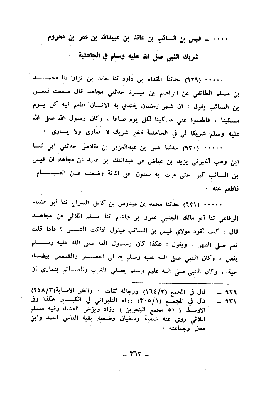 929 - حَدَّثَنَا الْمِقْدَامُ بْنُ دَاوُدَ، ثَنَا خَالِدُ بْنُ نِزَارٍ، ثَنَا مُحَمَّدُ بْنُ مُسْلِمٍ الطَّائِفِيُّ، عَنْ إِبْرَاهِيمَ بْنِ مَيْسَرَةَ، حَدَّثَنِي مُجَاهِدُ، قَالَ: سَمِعْتُ قَيْسَ بْنَ السَّائِبِ، يَقُولُ: «إِنَّ شَهْرَ رَمَضَانَ يَفْتَدِي بِهِ الْإِنْسَانُ، يُطْعِمُ فِيهِ كُلَّ يَوْمٍ مِسْكِينًا، فَأَطْعِمُوا عَنِّي مِسْكِينًا لِكُلِّ يَوْمٍ صَاعًا، §وَكَانَ رَسُولُ اللهِ صَلَّى اللهُ عَلَيْهِ وَسَلَّمَ شَرِيكًا لِي فِي الْجَاهِلِيَّةِ، فَخَيْرُ شَرِيكٍ لَا يُمَارِي وَلَا يُسَارِي»
